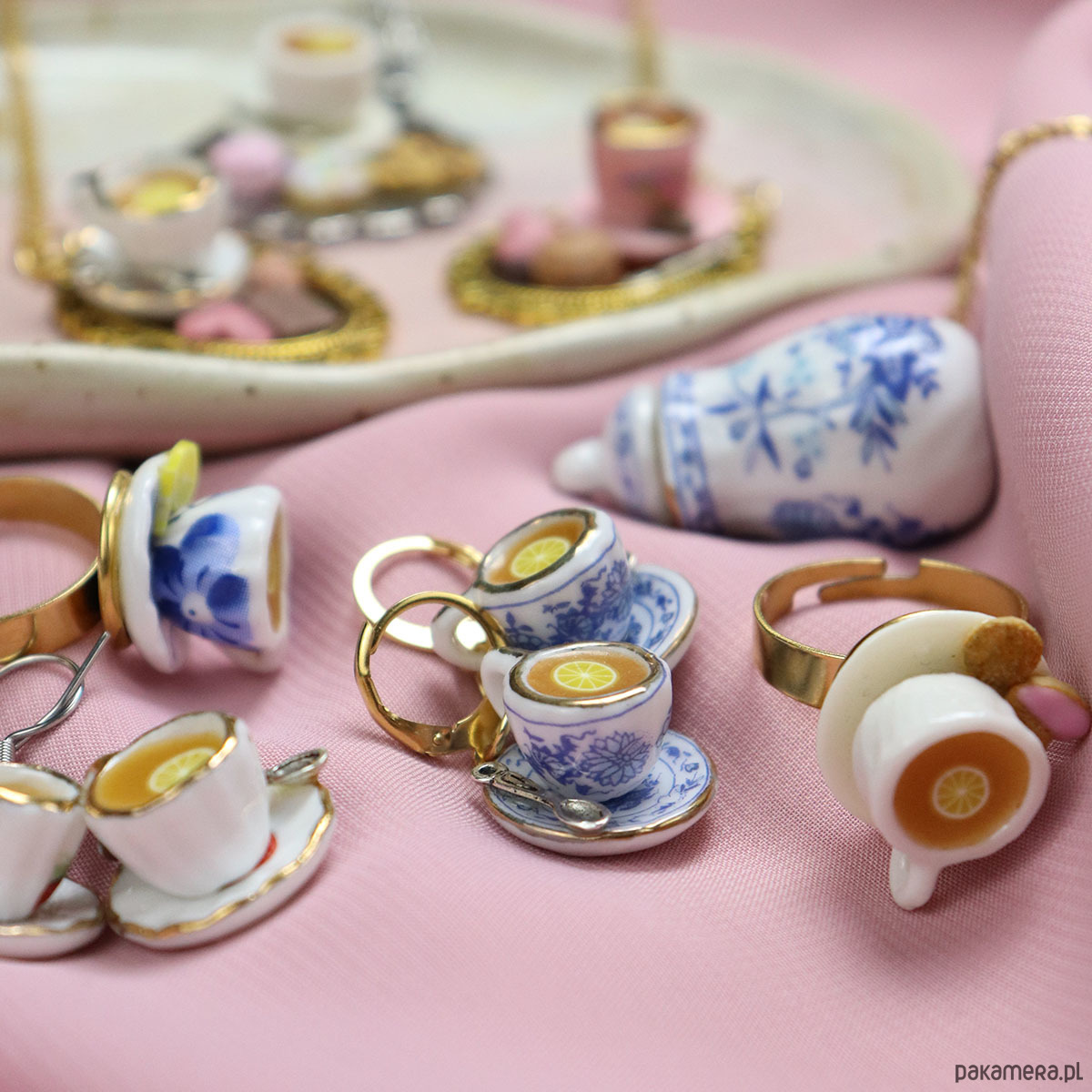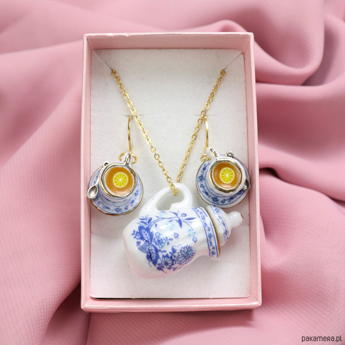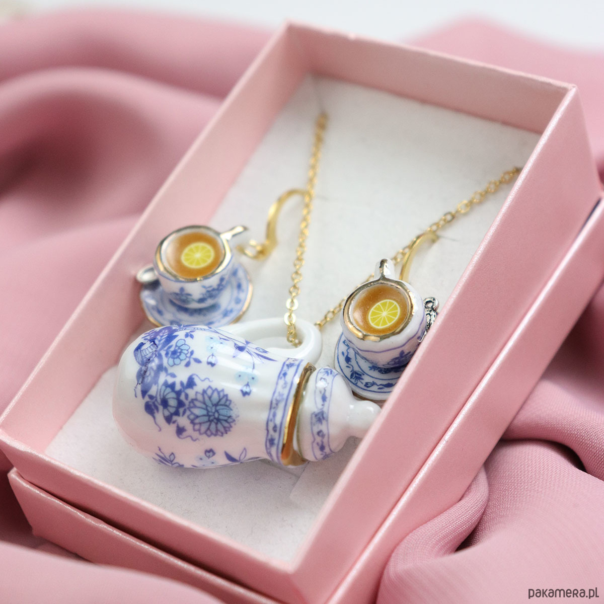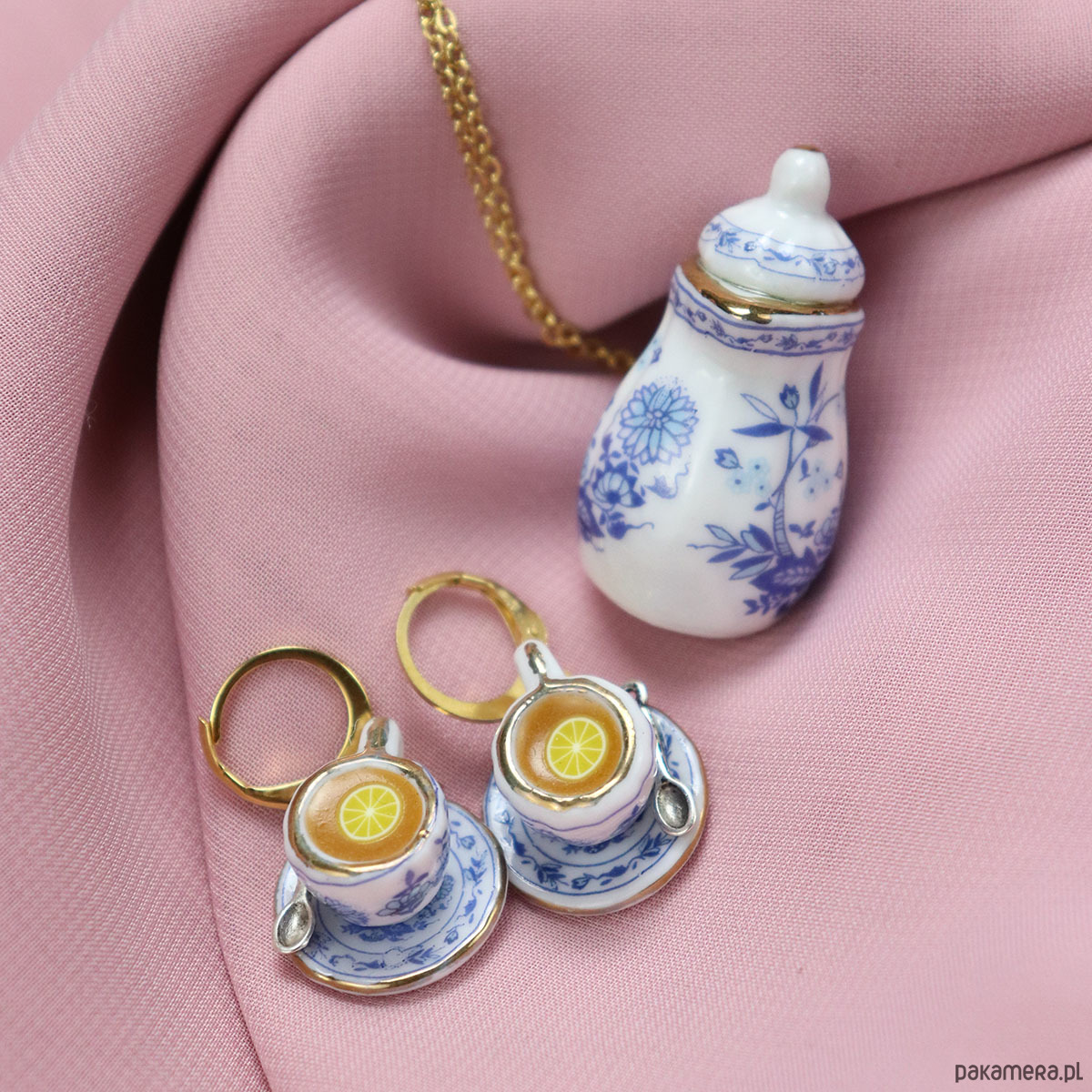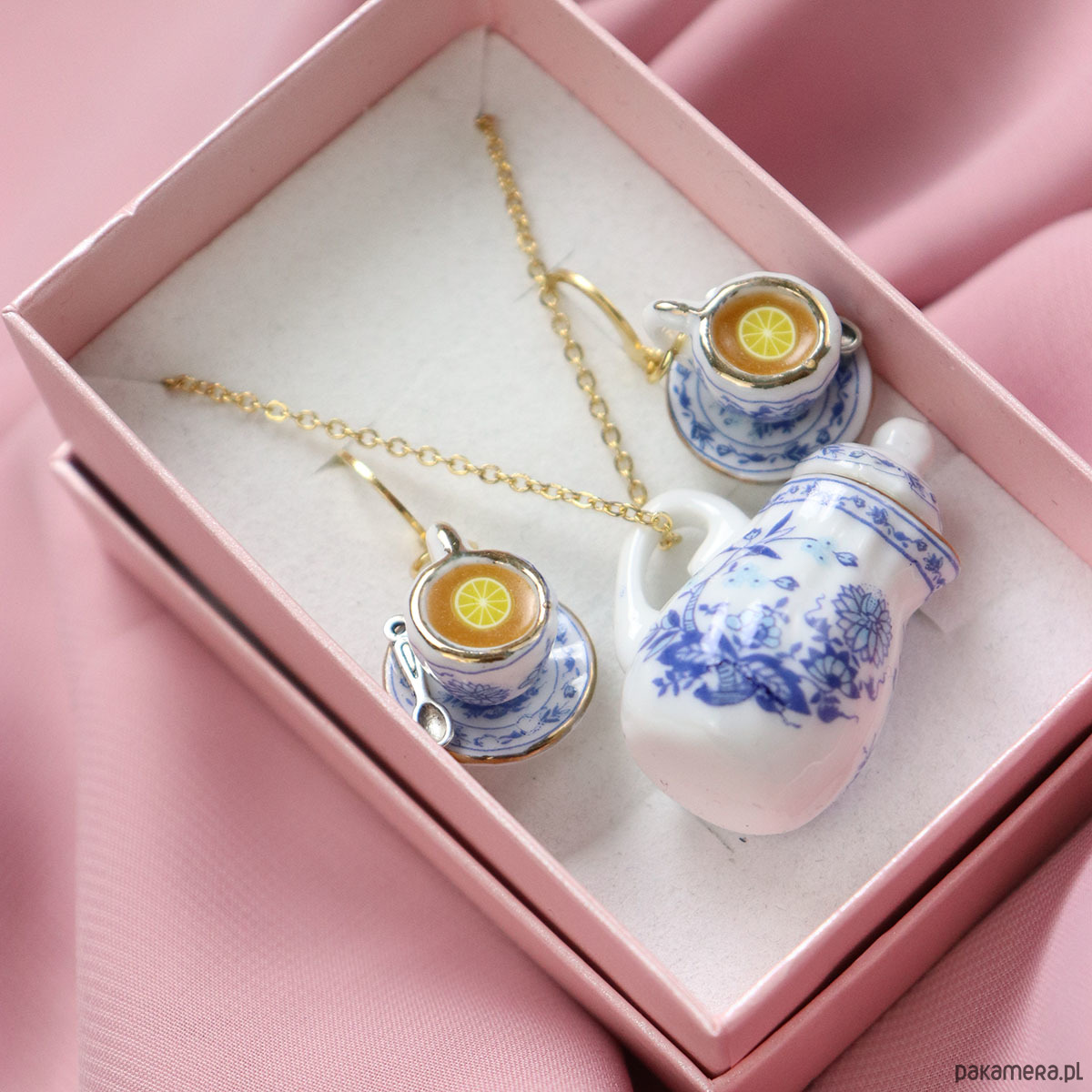 Przepiękny i oryginalny komplet. Kolczyki filiżanki z herbatą i imbryczek pomalowany w kwiaty. Całość wysyłam w ozdobnym pudełeczku - w sam raz na prezent.