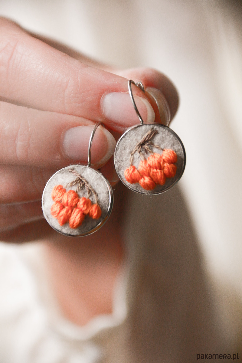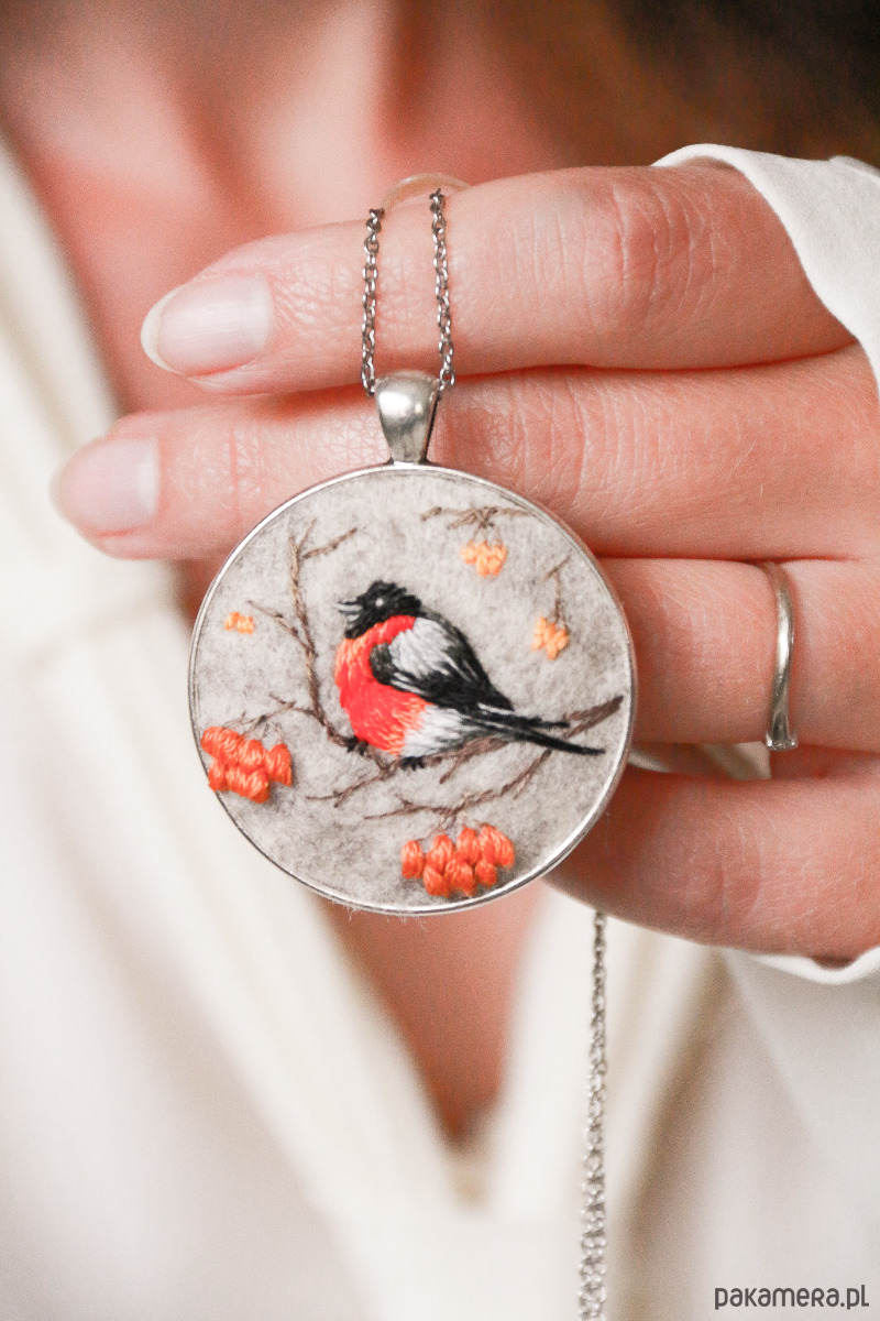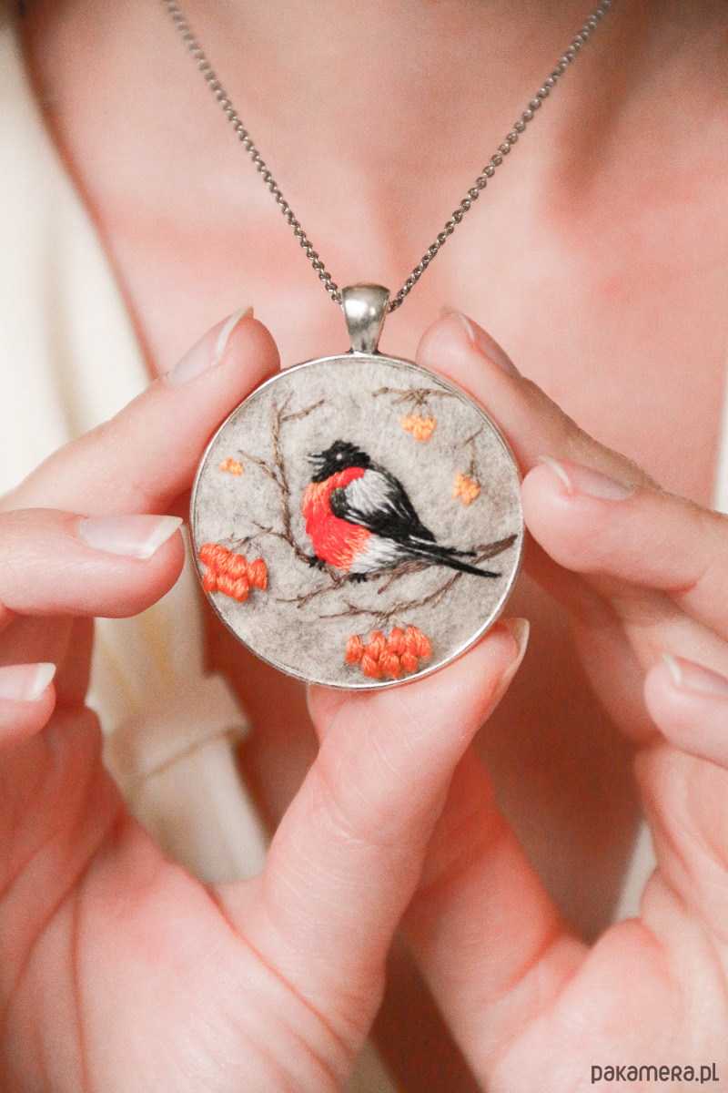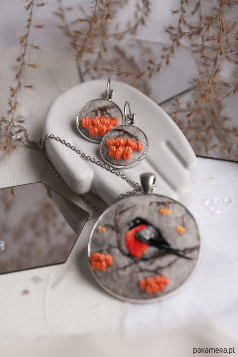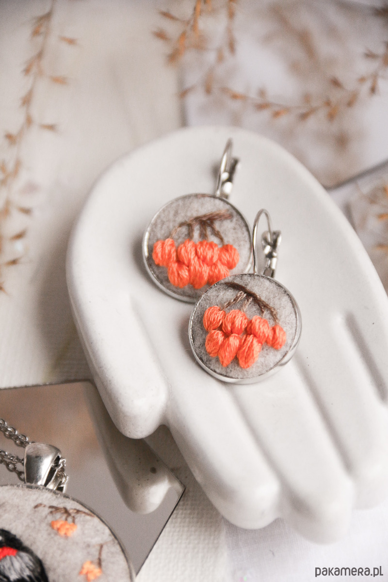 Ręcznie haftowany medalion z gilem będzie ozdobą każdej jesienno-zimowej stylizacji. Kolczyki z jarzębiną poprawią nastrój nawet w zimny, listopadowy poranek. ;)