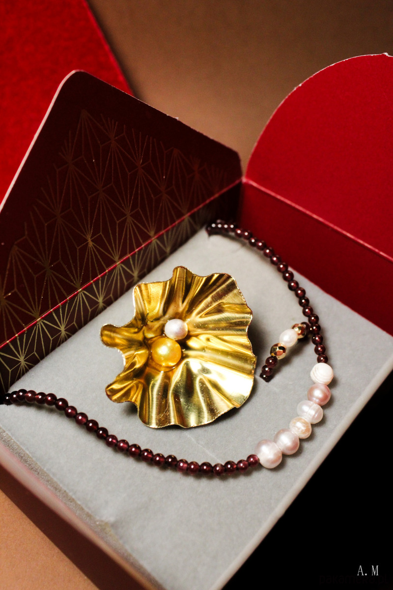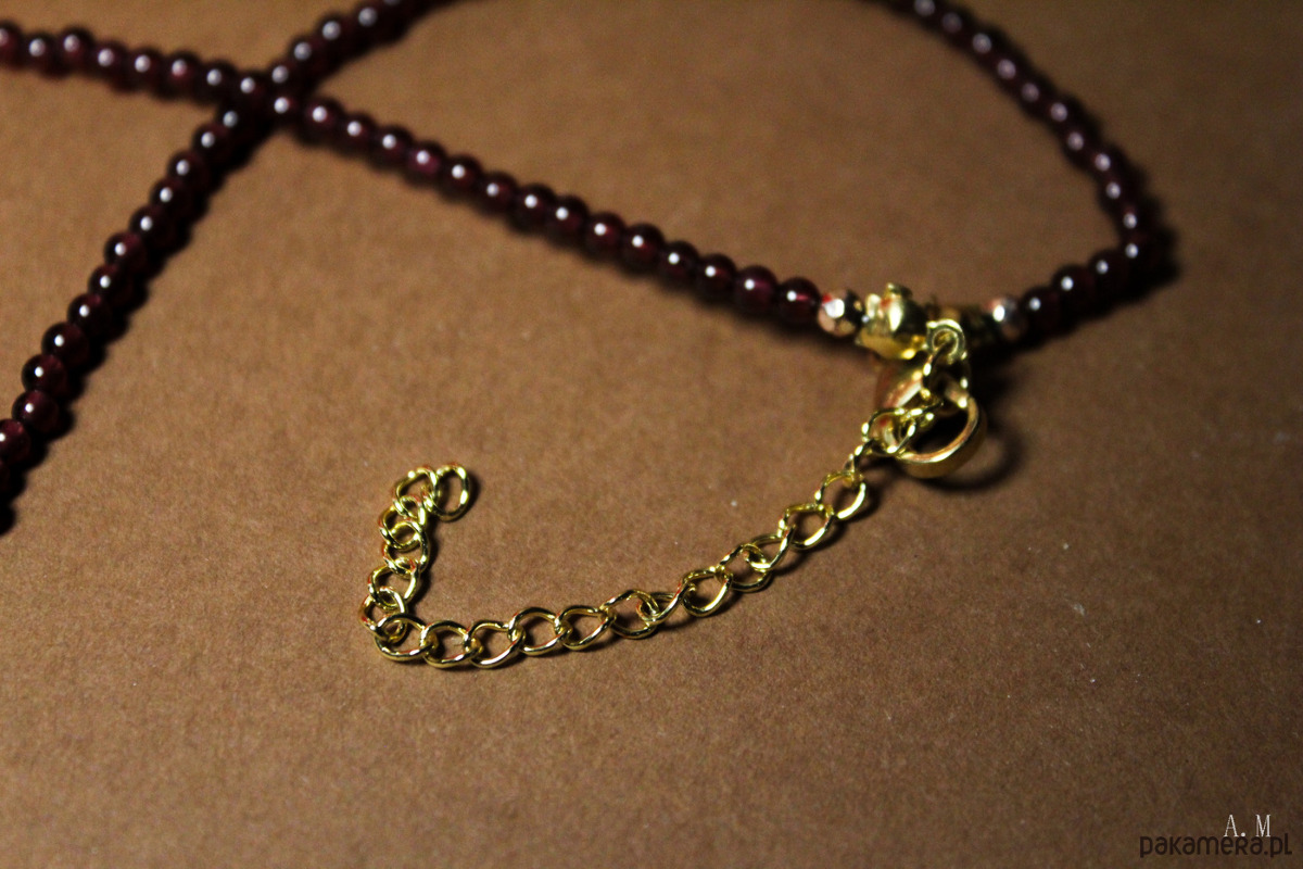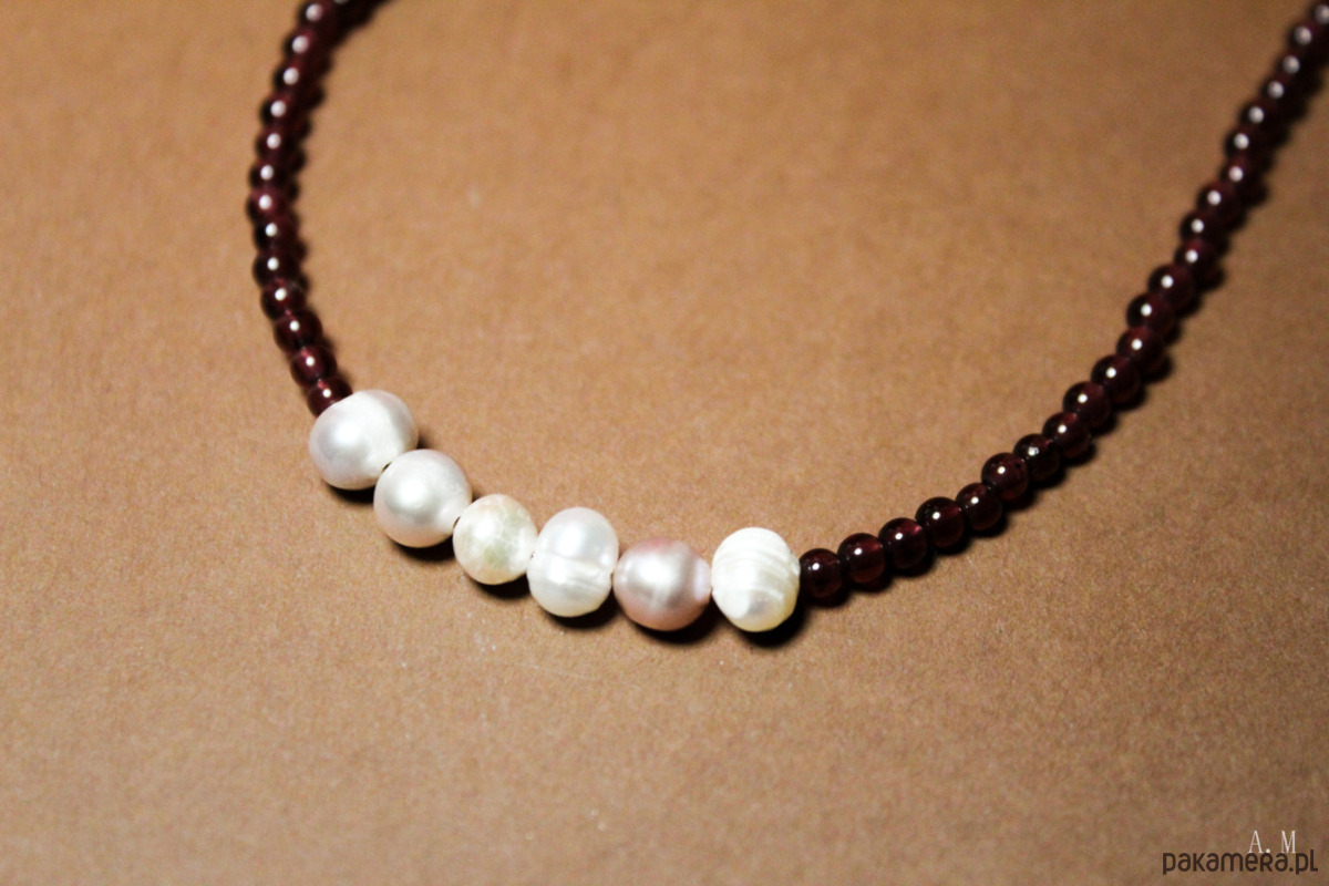 - naszyjnika z naturalnego Granatu oraz pereł hodowlanych o lekko surowym charakterze i bogactwie odcieni.