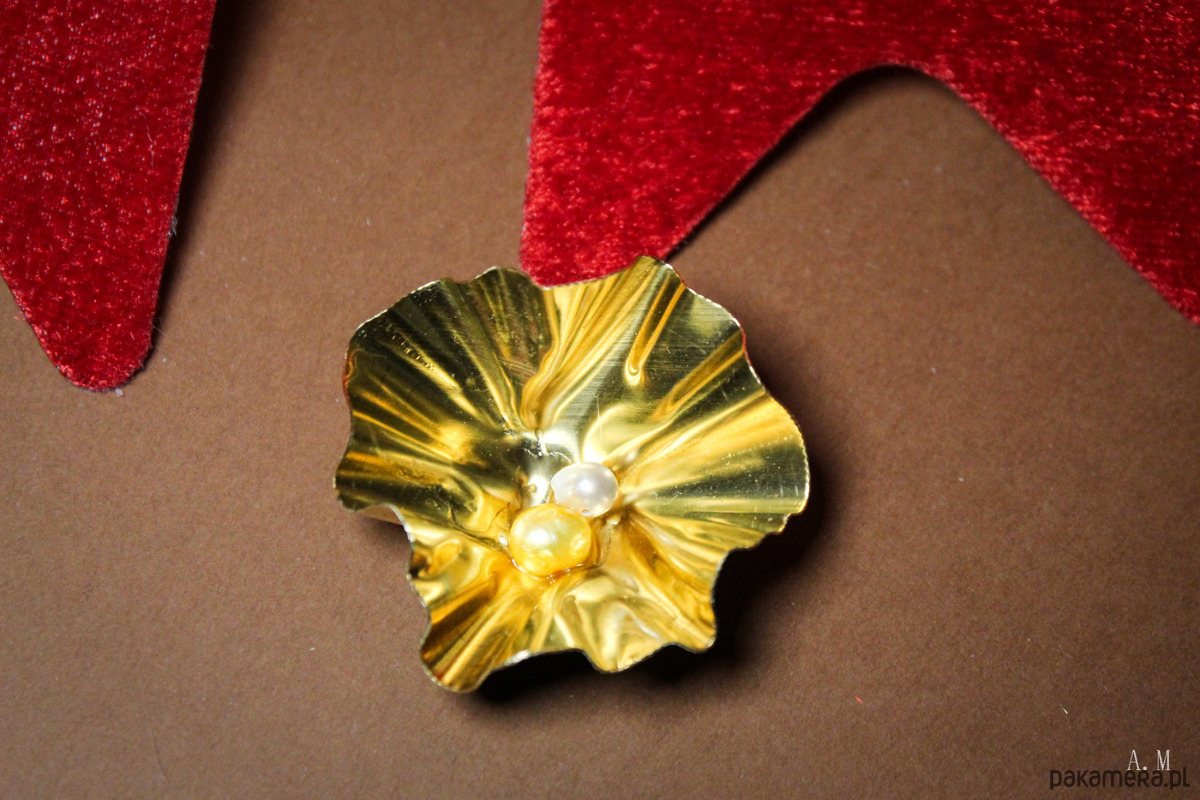 - broszki ręcznie kształtowanej z mosiądzu o kształcie kwiatu, którego sercem są dwie perły o odcieniach bieli oraz bursztynu. Do ukształtowania każdego kwiatu zostały wykorzystane jedynie dłonie oraz szczypce jubilerskie.