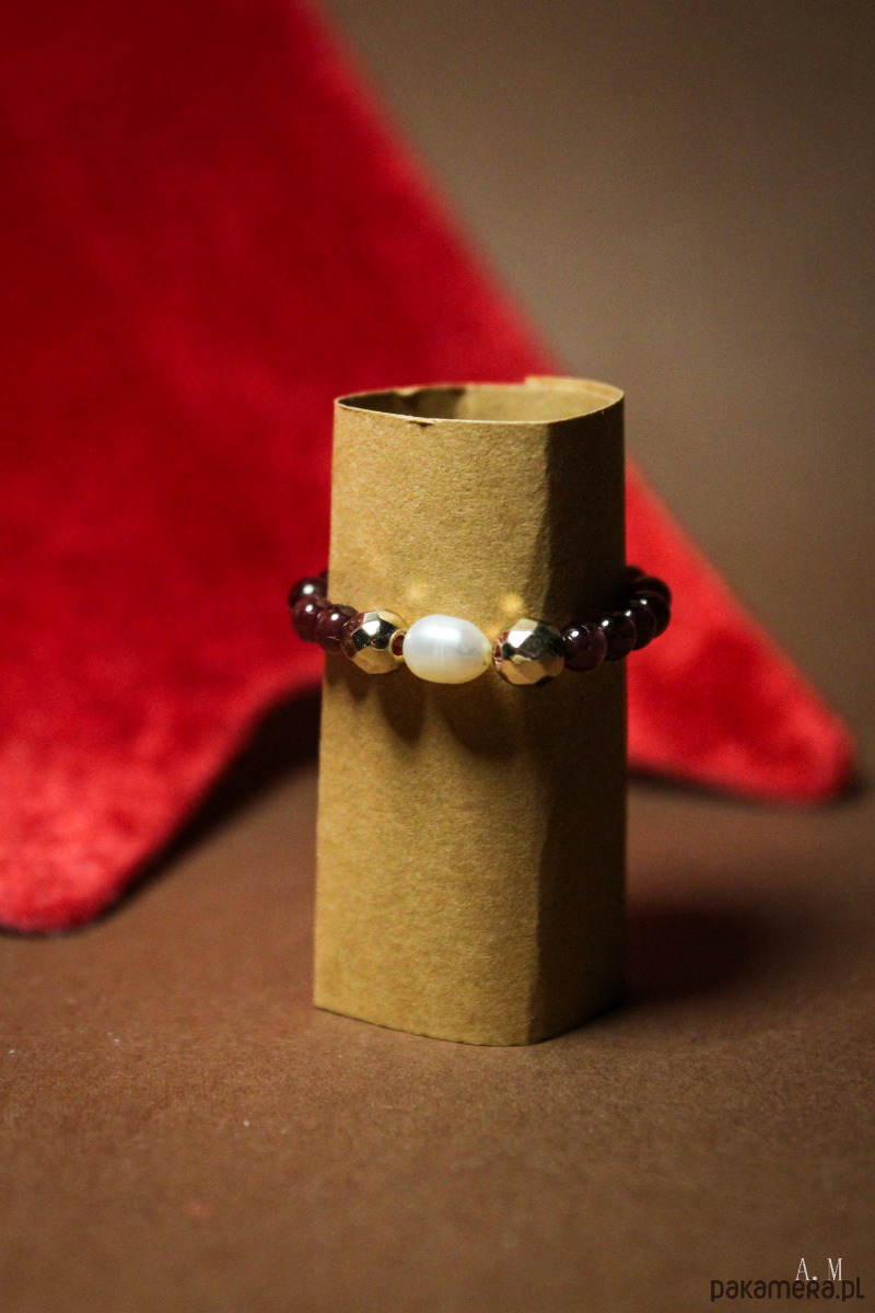 - pierścionka z naturalnego Granatu, Hematytu oraz perły hodowlanej. Pierścionek na gumce idealnie dopasowuje się do każdego rozmiaru palca.