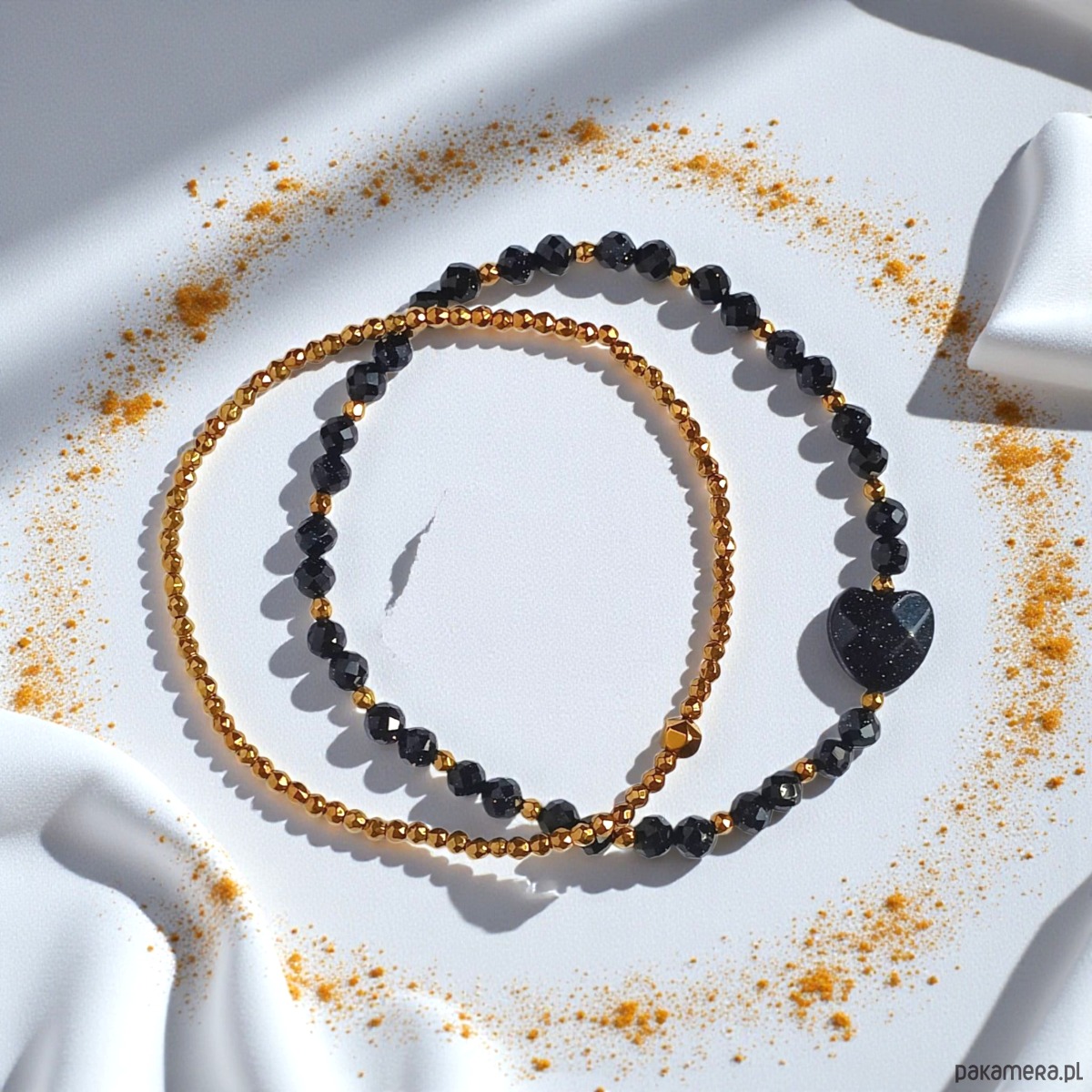 Bransoletki na solidnej lince elastycznej, wykonane z fasetowanych kul nocy kairu ok. 4mm oraz fasetowanych kuleczek (niecałe 2mm!) i ze złotego hematytu i fasetowanego serca z nocy kairu.