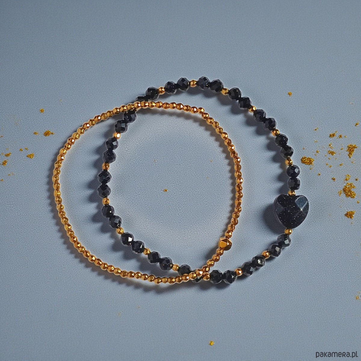 Bransoletki na solidnej lince elastycznej, wykonane z fasetowanych kul nocy kairu ok. 4mm oraz fasetowanych kuleczek (niecałe 2mm!) i ze złotego hematytu i fasetowanego serca z nocy kairu.
