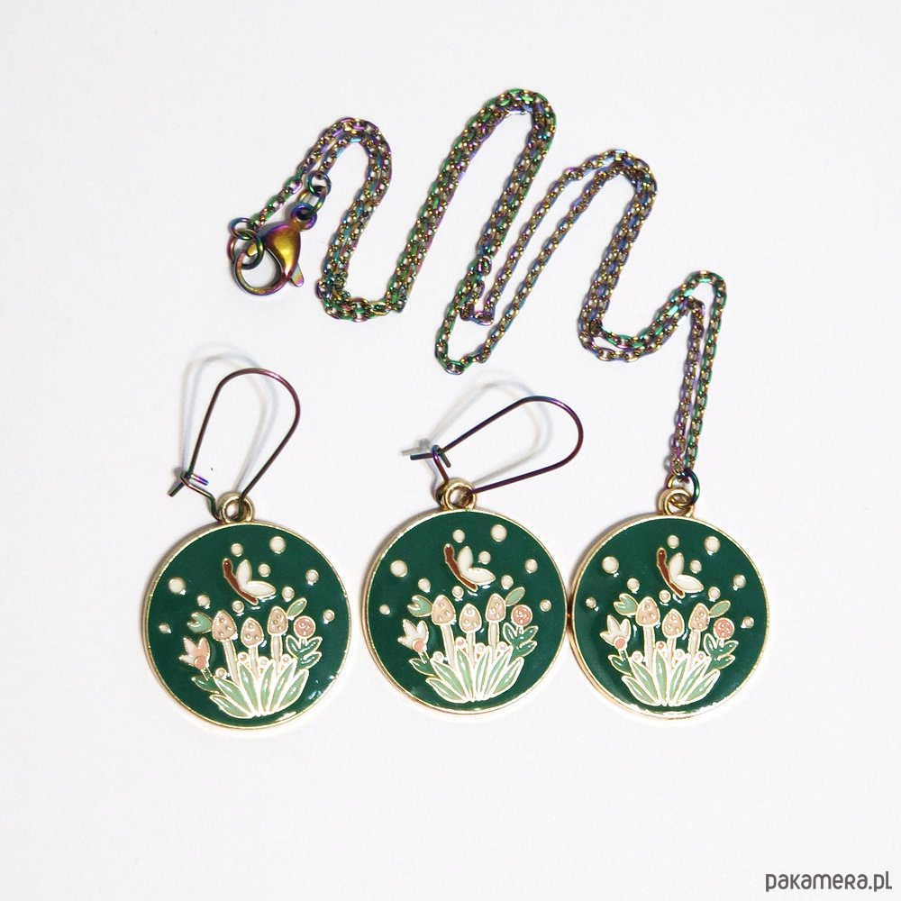 Kolczyki i naszyjnik z pięknymi zawieszkami emaliowanymi z motywem łąki, grzybków.