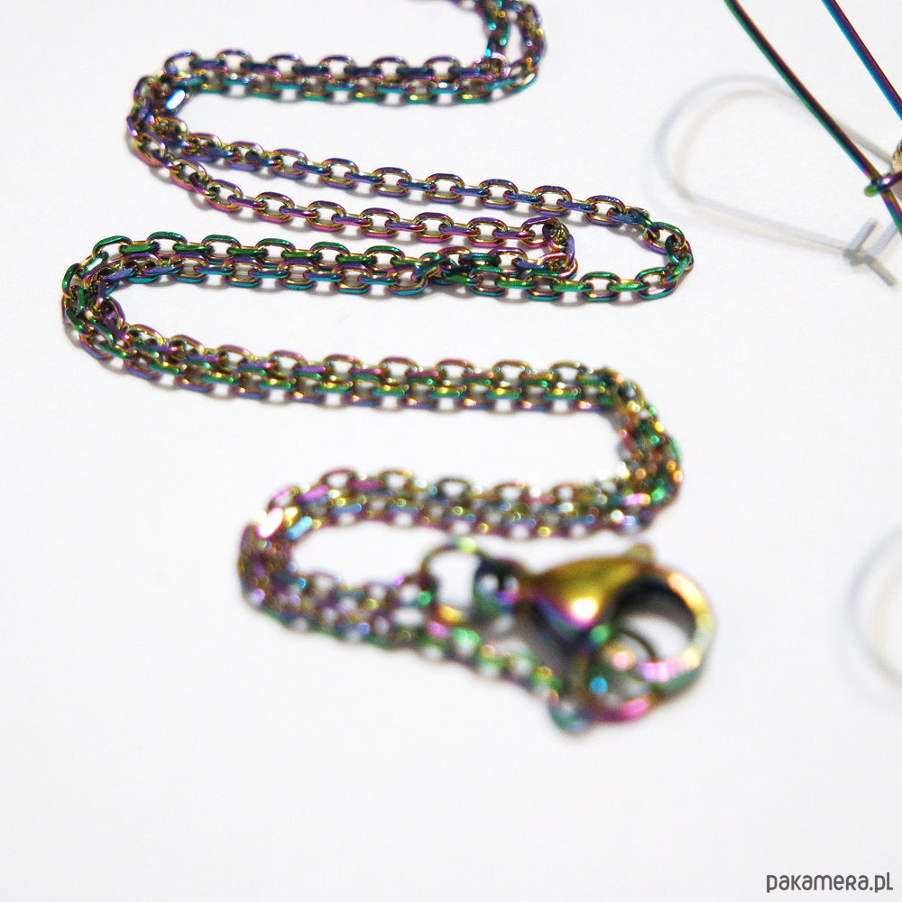 Bigle i łańcuszek cudnie mieniące się w odcieniach granatu, zieleni, turkusu, złota oraz fioletu i amarantu.