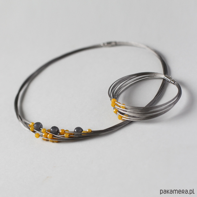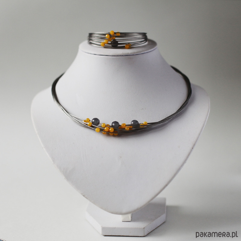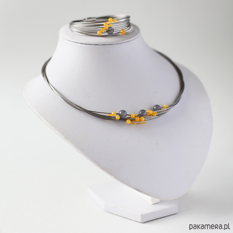 Wyrazisty i elegancki komplet zapleciony na bazie linki jubilerskiej z szarych i żółtych fasetowanych kul jadeitu.
