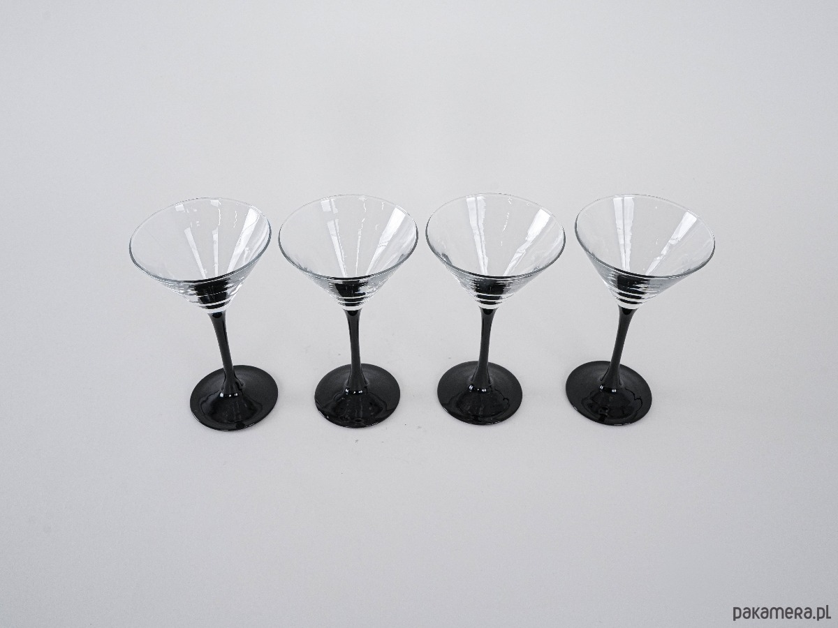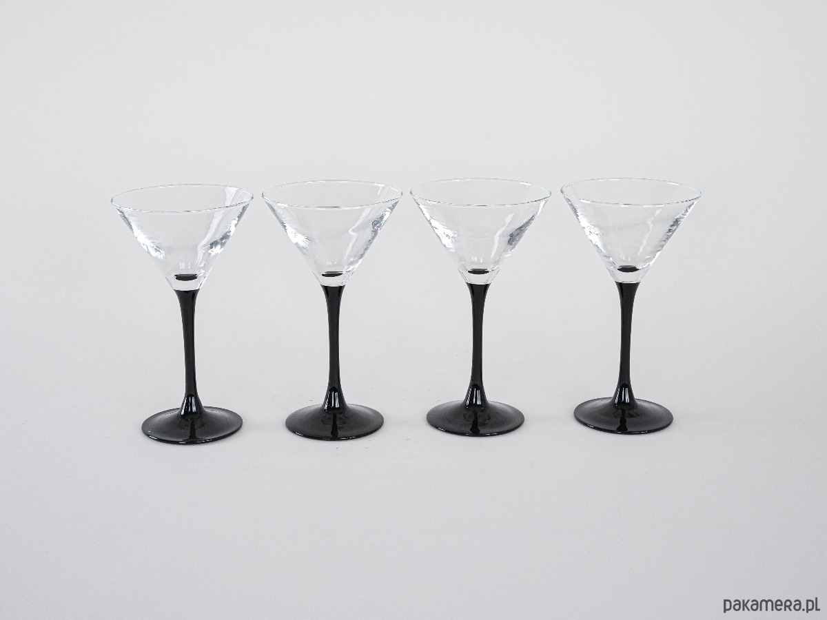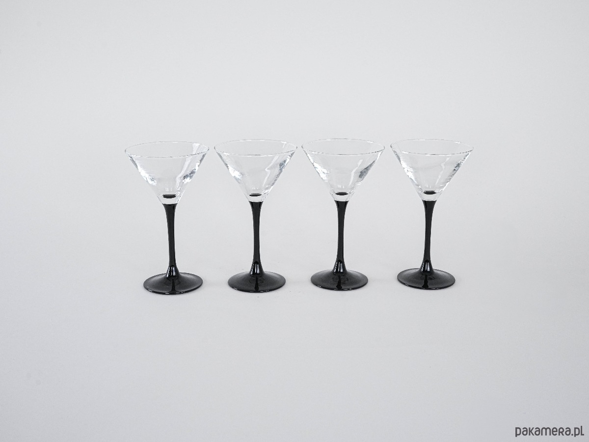 Kieliszki do martini, komplet 4 sztuki, vintage. Klasyczna, stożkowata czasza osadzona na smukłej czarnej nóżce tworzy efektowną całość, która podkreśli elegancję każdego serwowanego drinka. Stylowy kontrast szkła i czerni sprawia, że będą świetnym dodatkiem do domowego barku lub prezentem dla miłośników designu z połowy XX wieku.