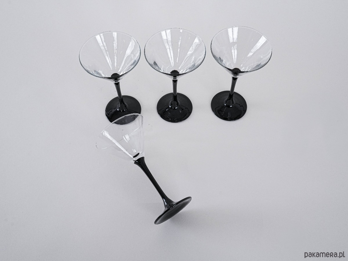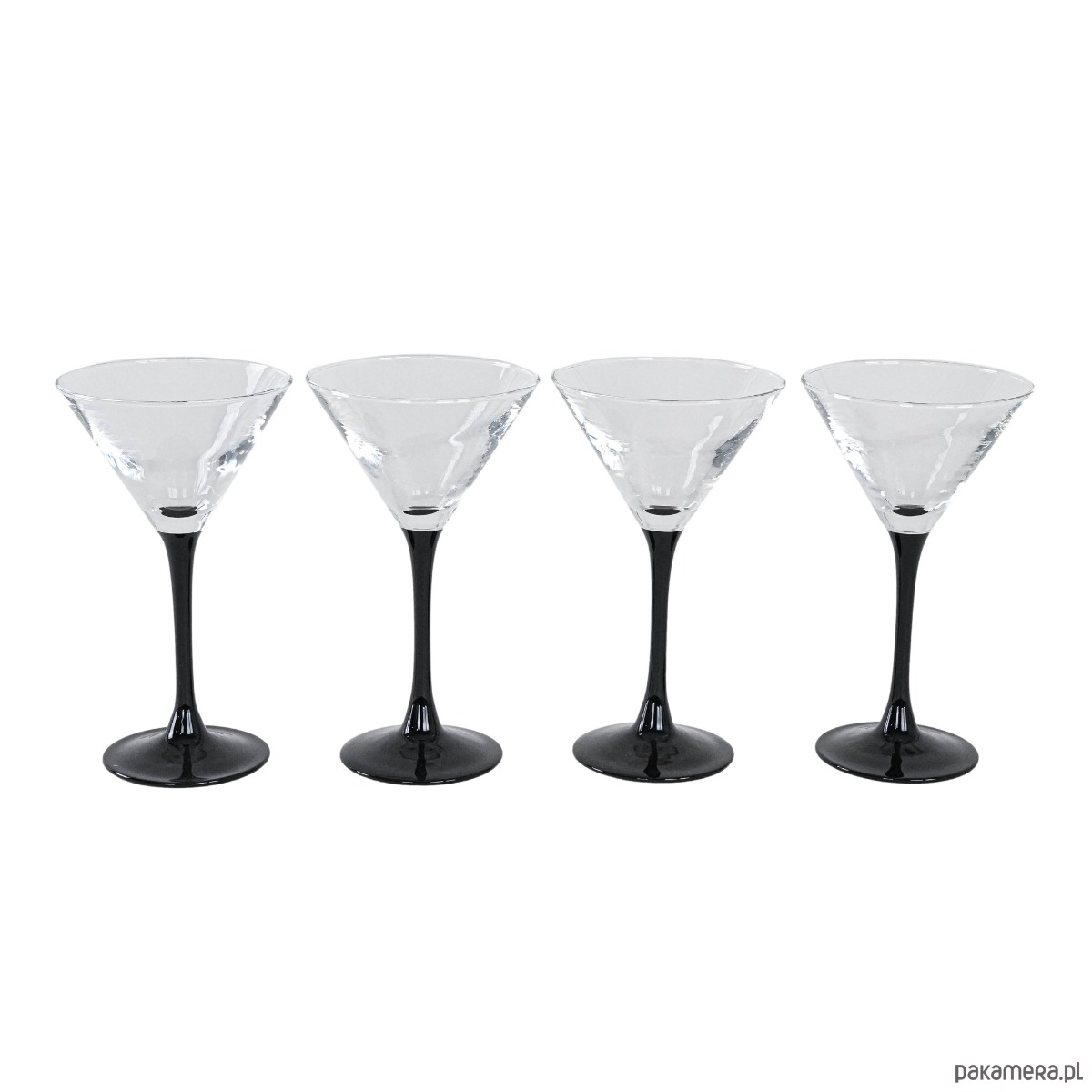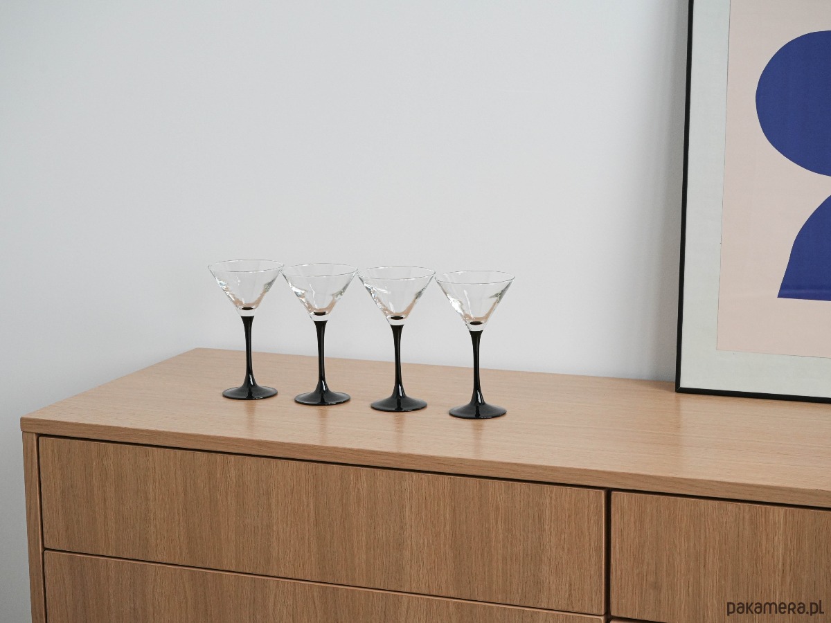 Kieliszki do martini, komplet 4 sztuki, vintage. Klasyczna, stożkowata czasza osadzona na smukłej czarnej nóżce tworzy efektowną całość, która podkreśli elegancję każdego serwowanego drinka. Stylowy kontrast szkła i czerni sprawia, że będą świetnym dodatkiem do domowego barku lub prezentem dla miłośników designu z połowy XX wieku.