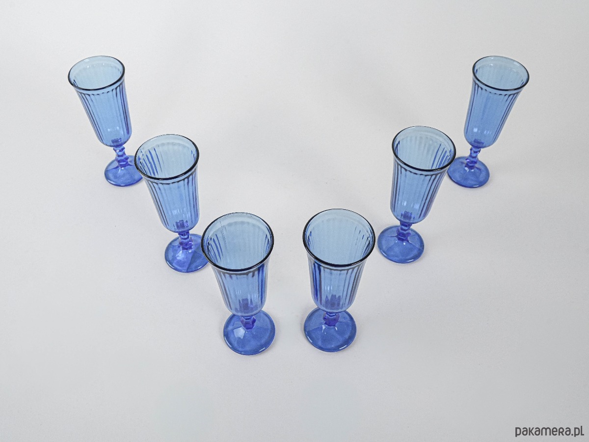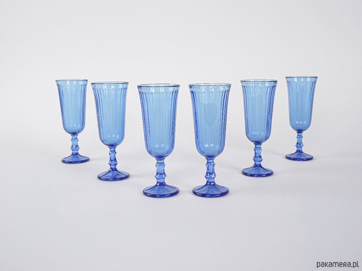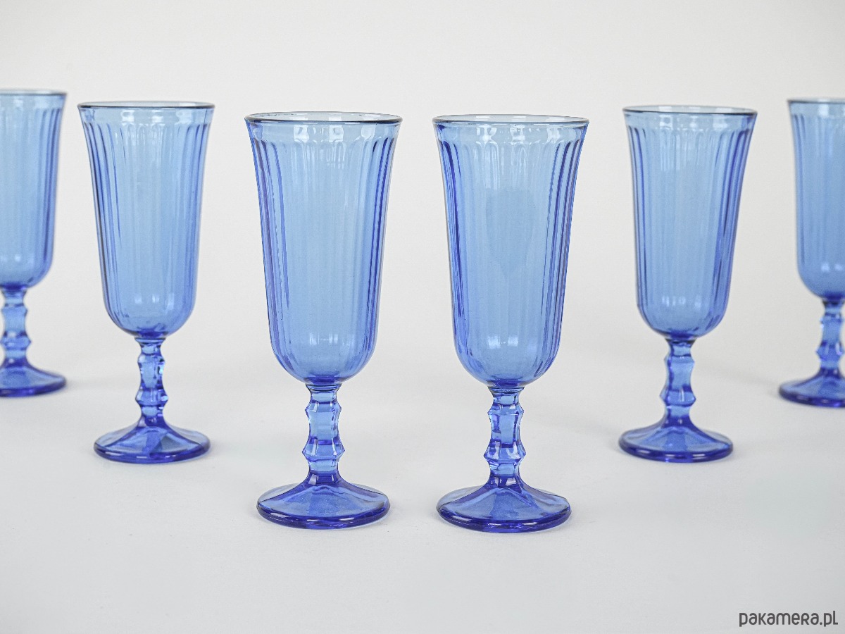 Komplet sześciu kieliszków z intensywnie kobaltowego szkła, o smukłej czarce z delikatnym żłobieniem i dekoracyjną, profilowaną nóżką. Forma łączy elegancję z nutą retro, charakterystyczną dla szkła stołowego z drugiej połowy XX wieku. Idealne do serwowania wina, koktajli lub deserów w efektownej oprawie.