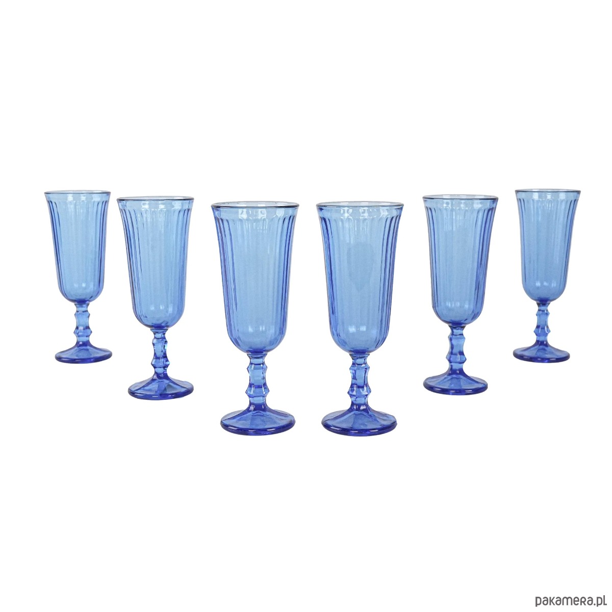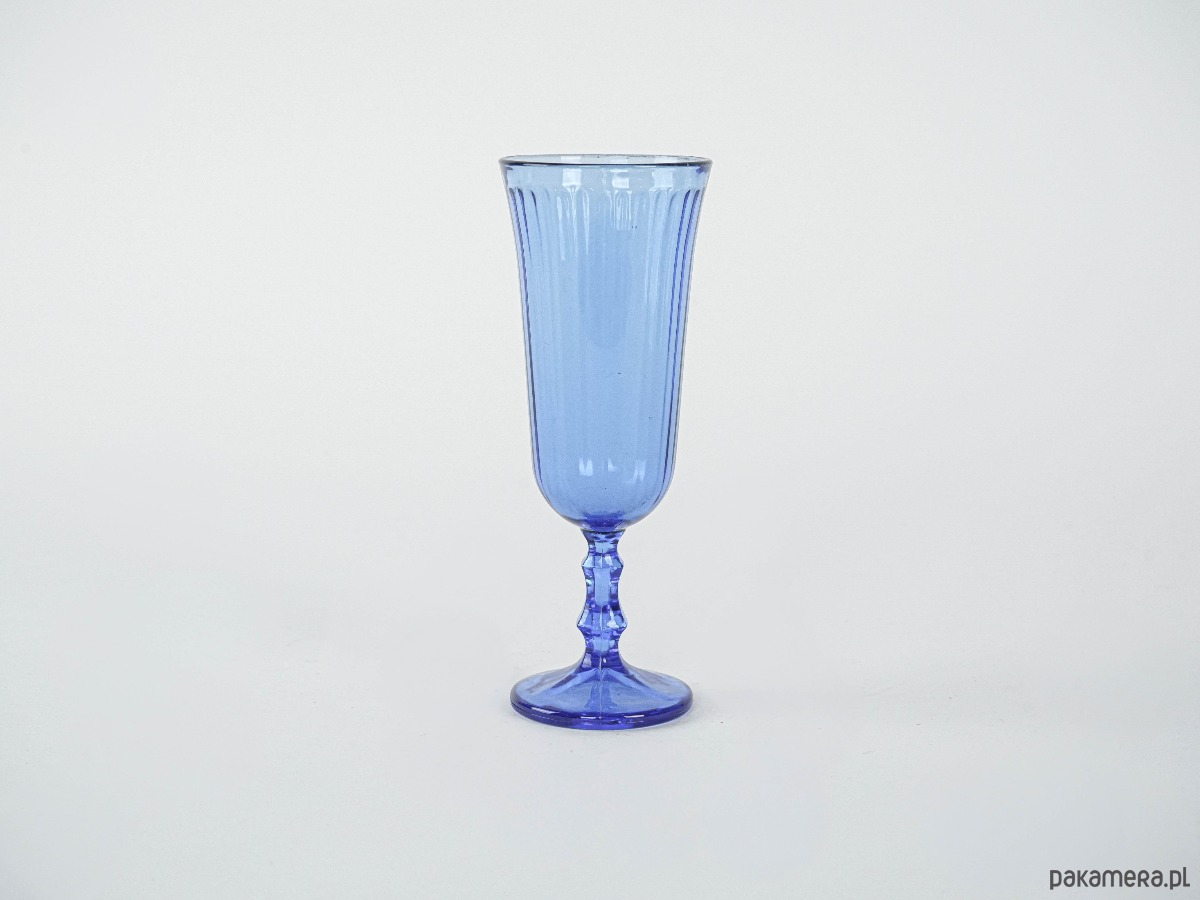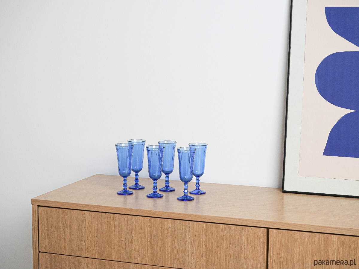 Komplet sześciu kieliszków z intensywnie kobaltowego szkła, o smukłej czarce z delikatnym żłobieniem i dekoracyjną, profilowaną nóżką. Forma łączy elegancję z nutą retro, charakterystyczną dla szkła stołowego z drugiej połowy XX wieku. Idealne do serwowania wina, koktajli lub deserów w efektownej oprawie.