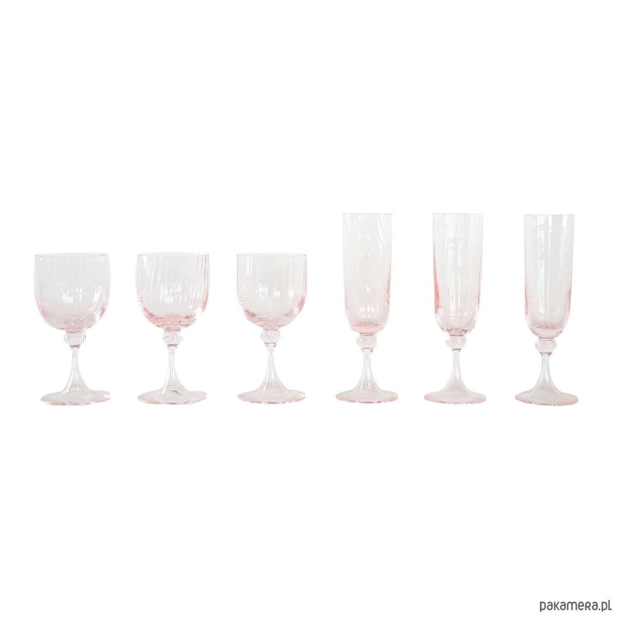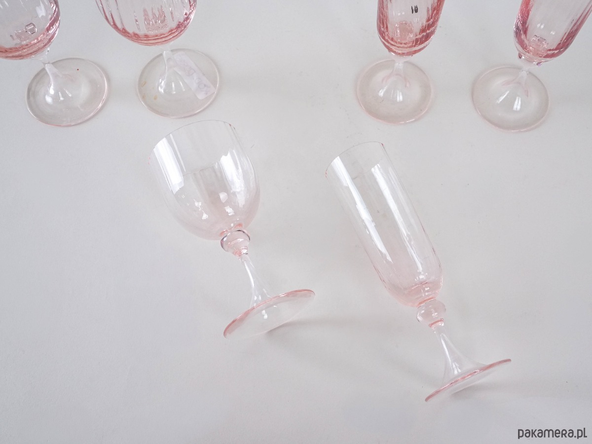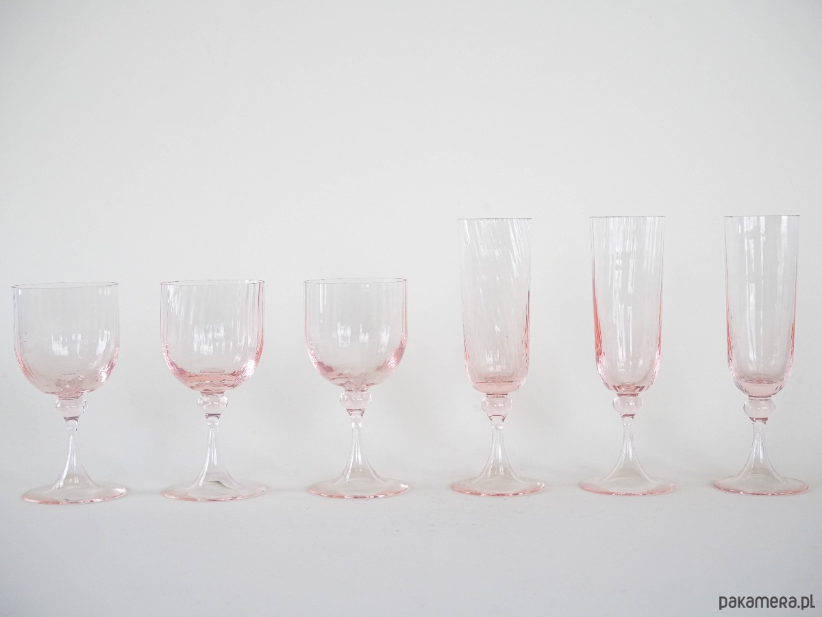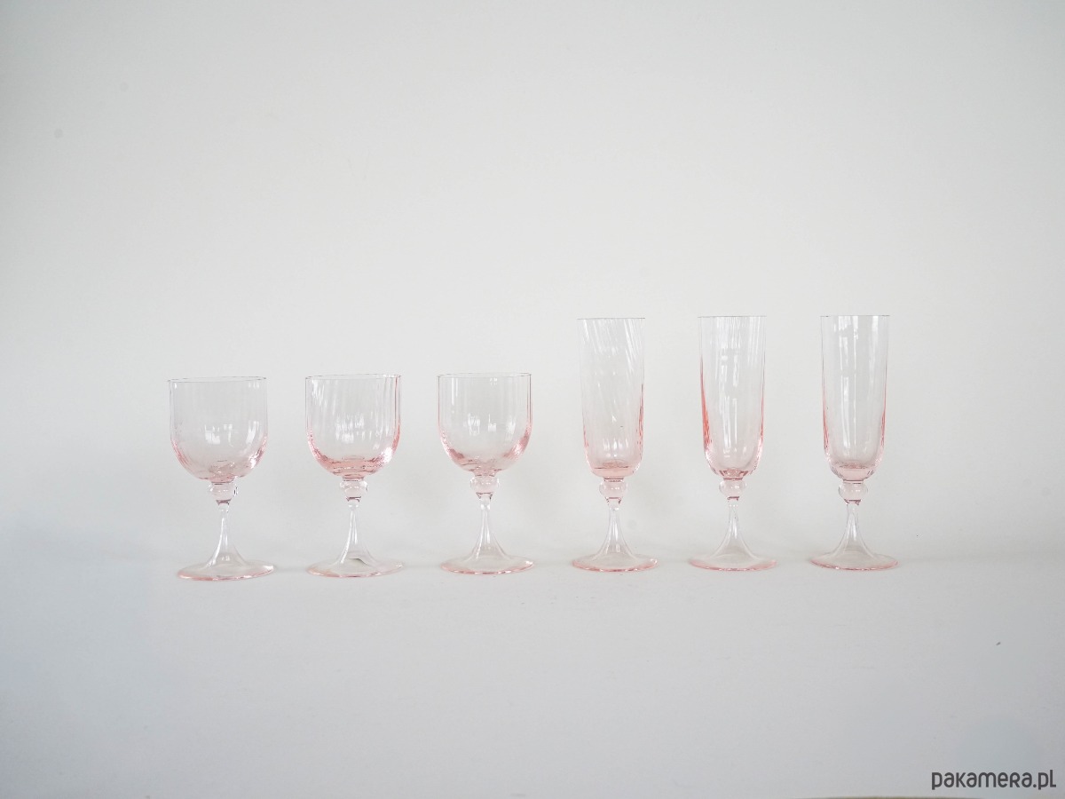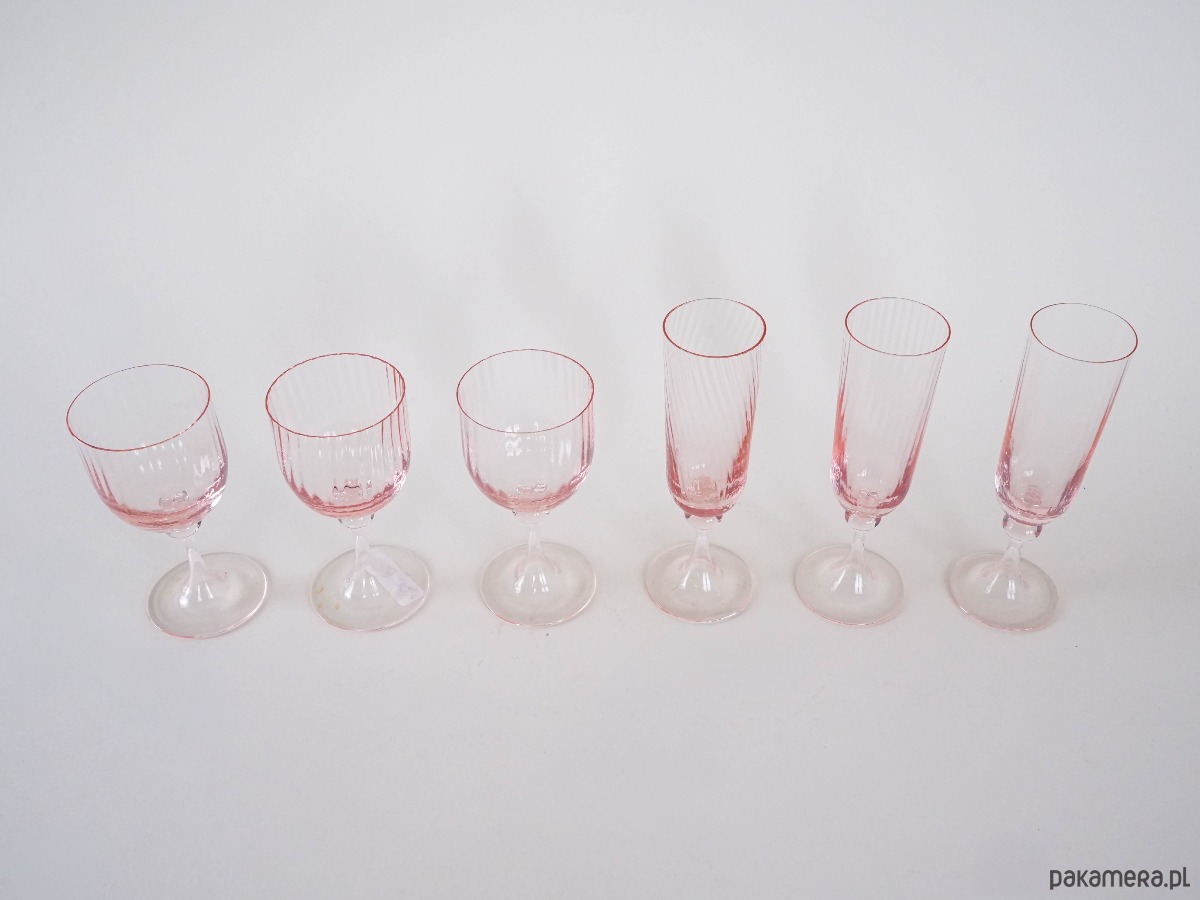 Zestaw 6 kieliszków vintage z różowego szkła dmuchanego – 3 do wina i 3 do szampana, z dekoracyjnymi nóżkami i delikatnym żebrowaniem. Styl inspirowany francuskim szkłem z lat 50./60., możliwy wyrób Luminarc lub rękodzieło w duchu mid-century modern.