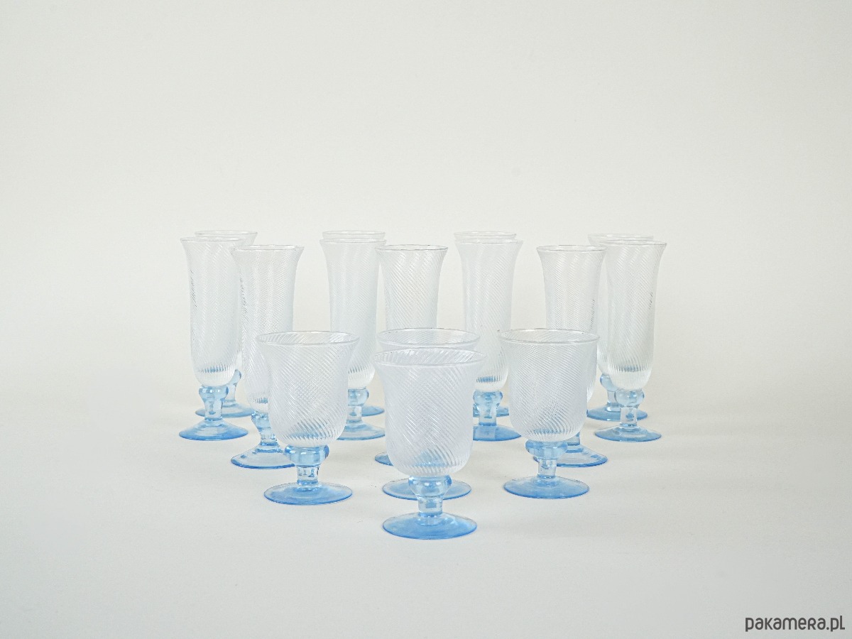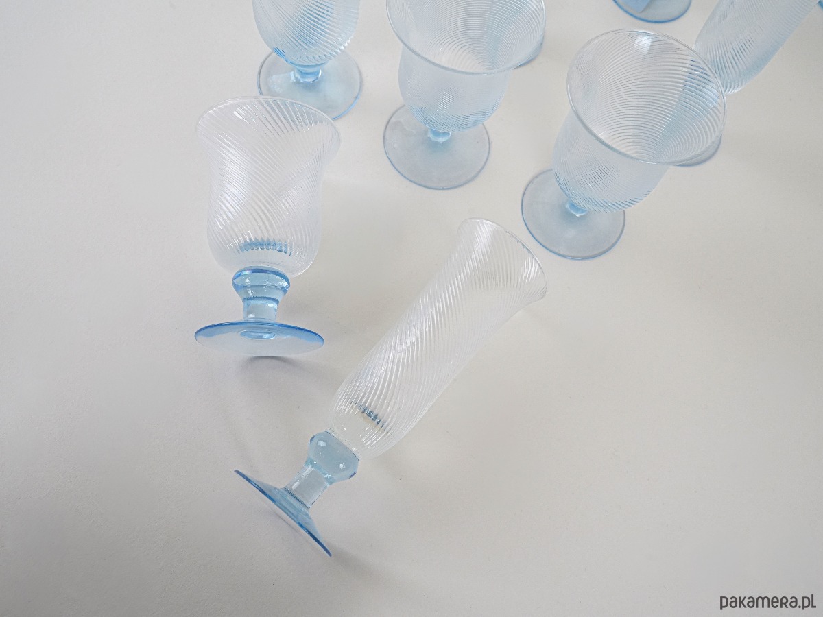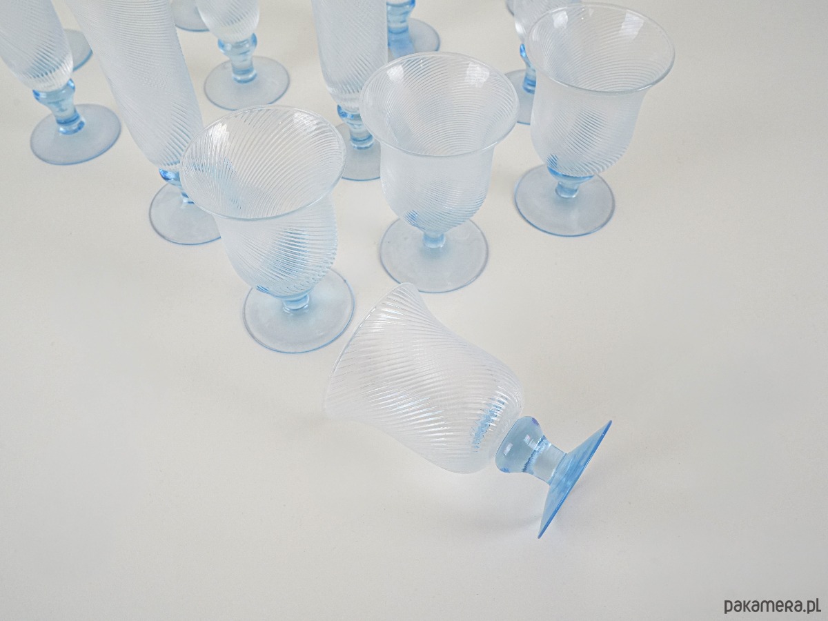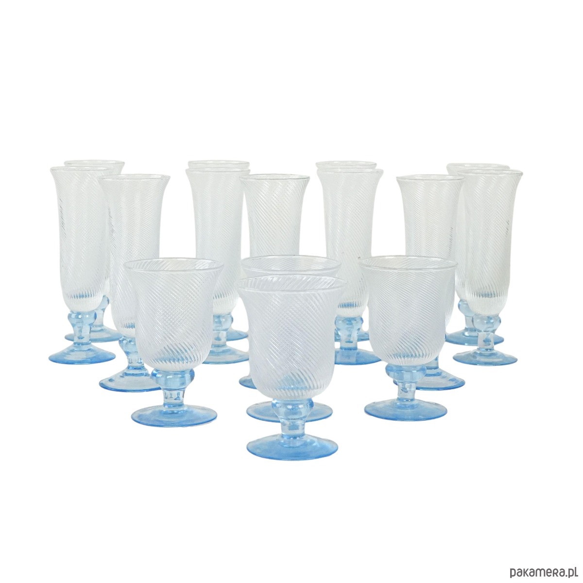 Komplet kieliszków z delikatnie niebieskiego, transparentnego szkła, zdobionych spiralnym, tłoczonym wzorem. Smukłe, eleganckie formy na szerokiej stopce dodają im lekkości i finezji. Idealne do serwowania deserów, koktajli lub napojów, wprowadzając na stół subtelny, vintage’owy akcent.
