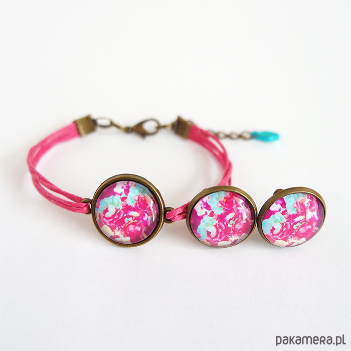 Komplet - klipsy i bransoletka - amarant, róże
