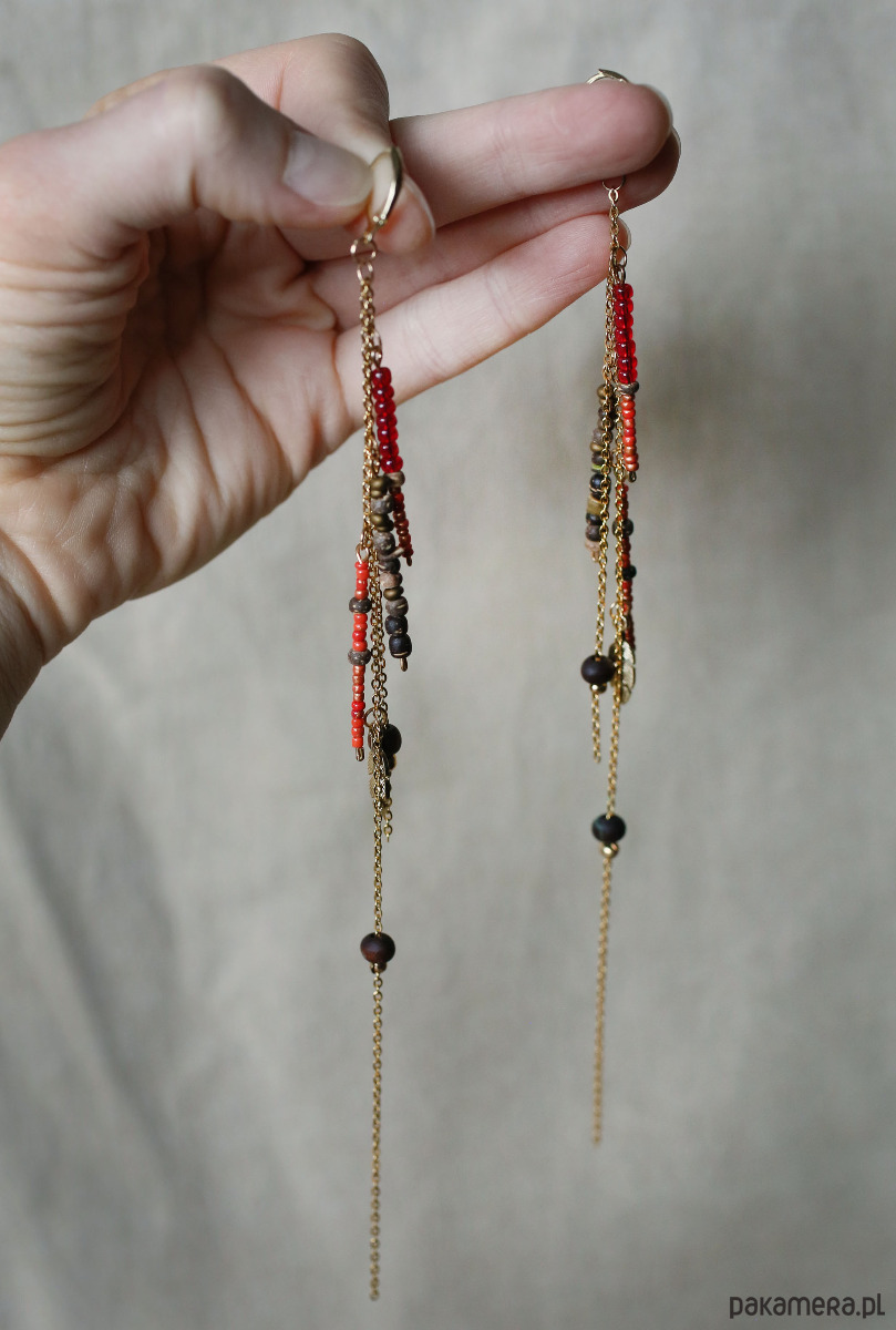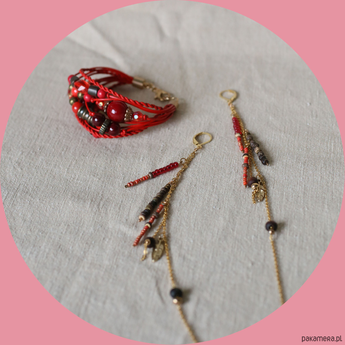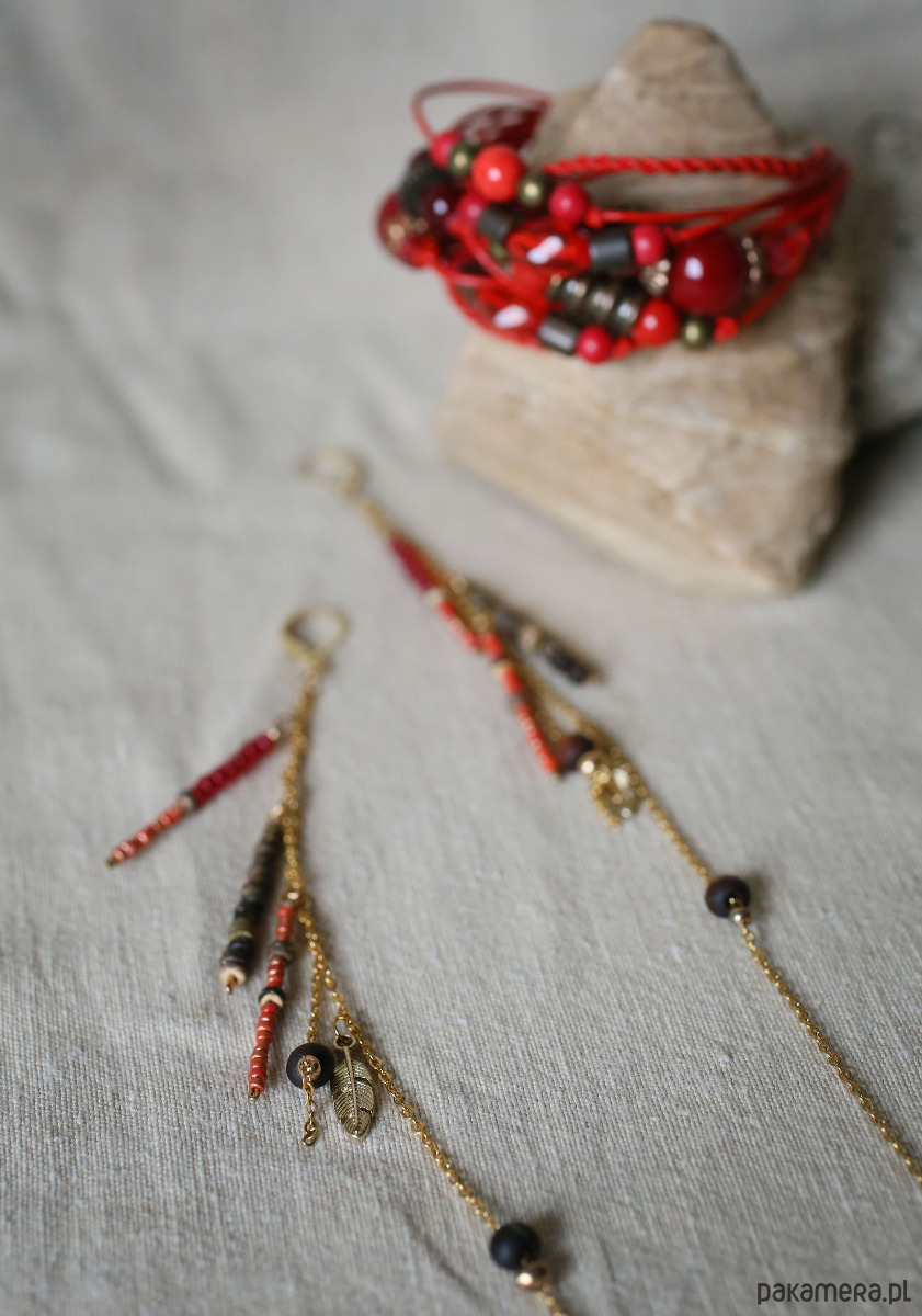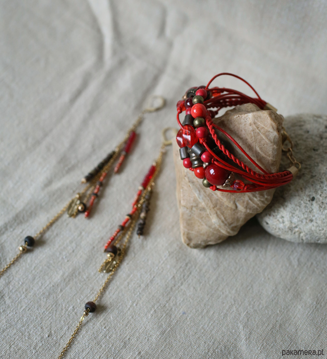 Kolczyki i bransoletka czerwonych rzemieni, łańcuszków i koralików w tonacji czerwonej. Bransoletka zapinana na karabińczyk. Bigle i łączniki ze stali w kolorze złota. Bransoletka pasuje na nadgarstek o obwodzie 15-16 cm. Długość kolczyków z biglem: 20 cm.