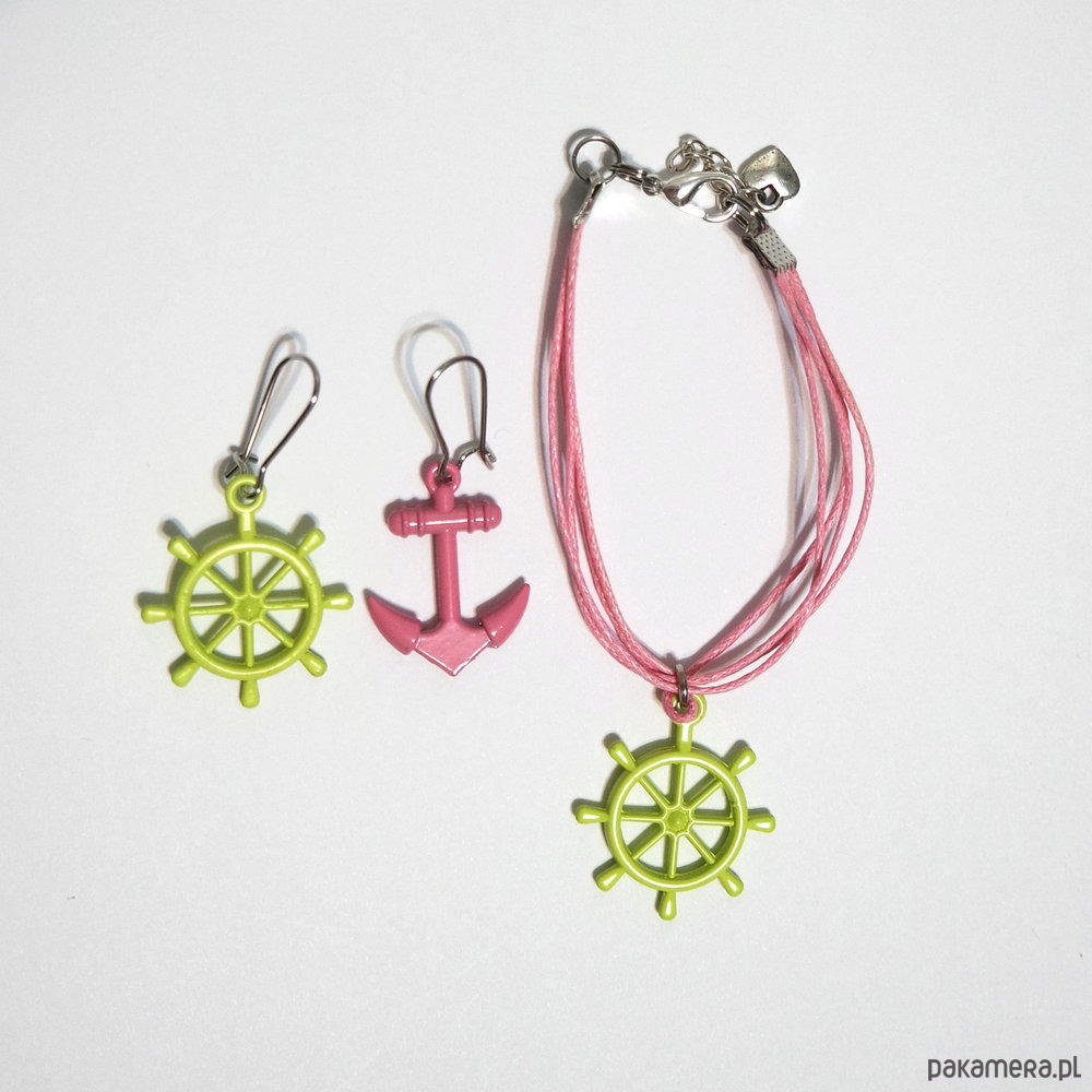 Komplet - Kotwica ster, zieleń, róż - kolczyki, bransoletka