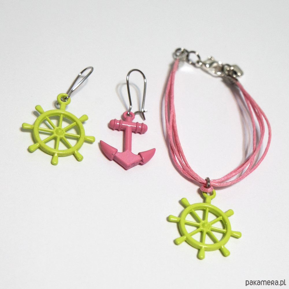 Komplet - Kotwica ster, zieleń, róż - kolczyki, bransoletka