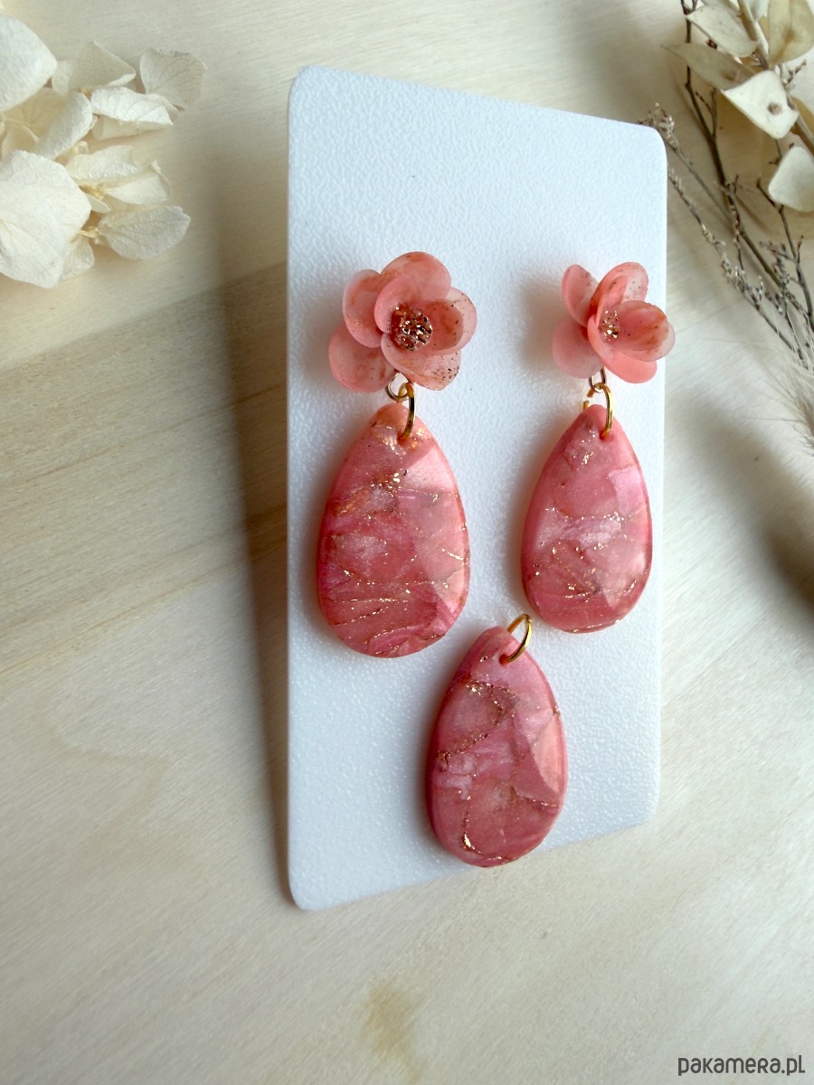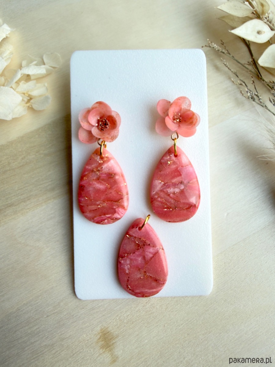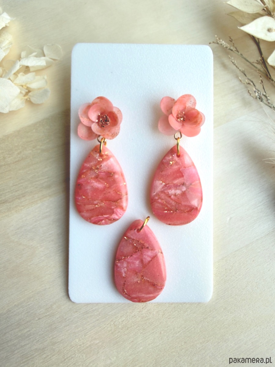 Brzoskwiniowy komplet to romantyczna, delikatna propozycja, która pięknie rozświetla cerę i świetnie sprawdza się zarówno na co dzień, jak i na specjalne okazje. W zestawie znajdują się wiszące kolczyki z kwiatem i kroplą oraz zawieszka z tej samej kolekcji, wykonane ręcznie z gliny polimerowej w odcieniach brzoskwiniowo‑różowych z drobnym złotym brokatem, na bazach ze stali chirurgicznej i pozłacanych elementach.