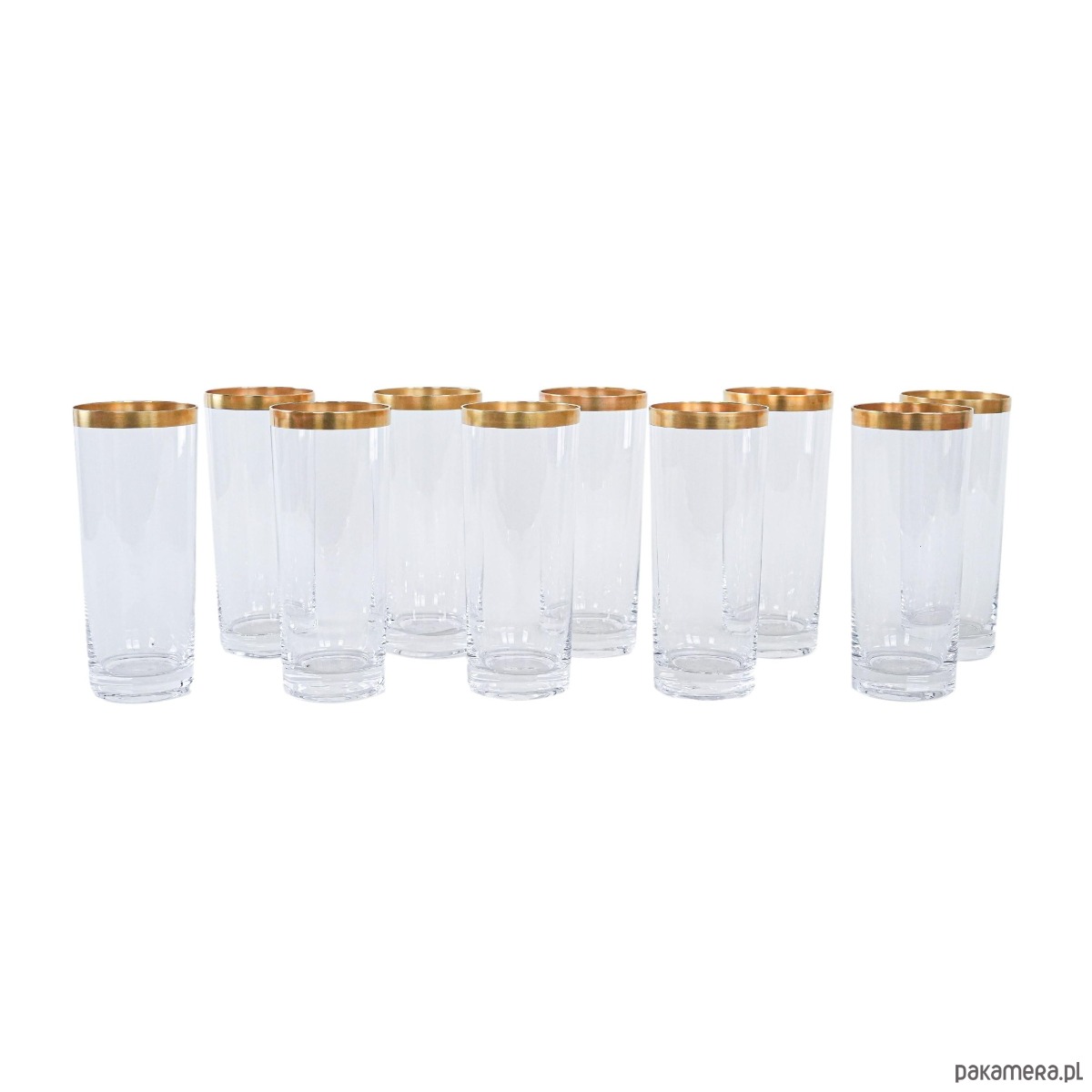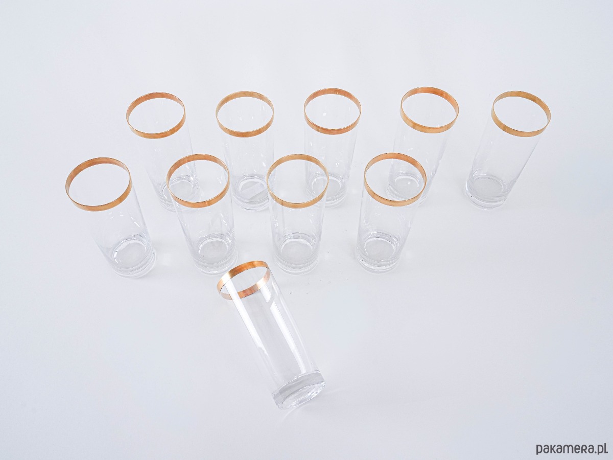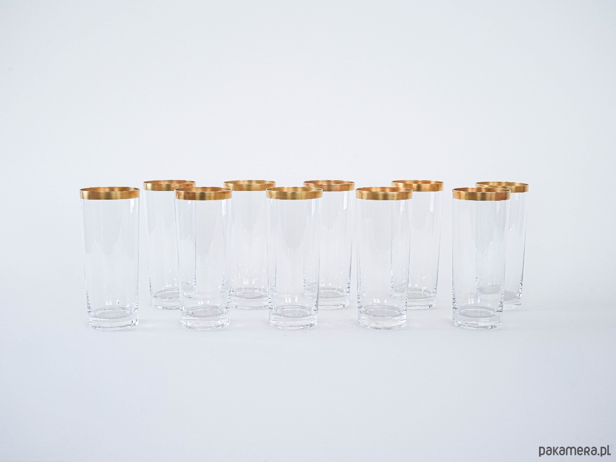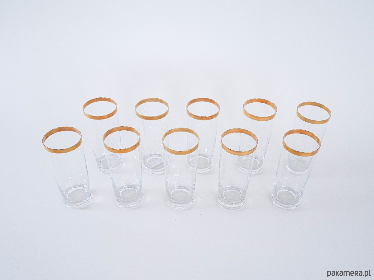 Zestaw 10 kryształowych szklanek vintage z lat 70., ozdobionych elegancką złotą obręczą przy krawędzi. Szklanki świetnie sprawdzą się do serwowania wody, soków, koktajli czy drinków, a jednocześnie stanowią efektowny element dekoracyjny stołu lub witryny. To propozycja dla miłośników szkła vintage i eleganckiego designu z lat 70.