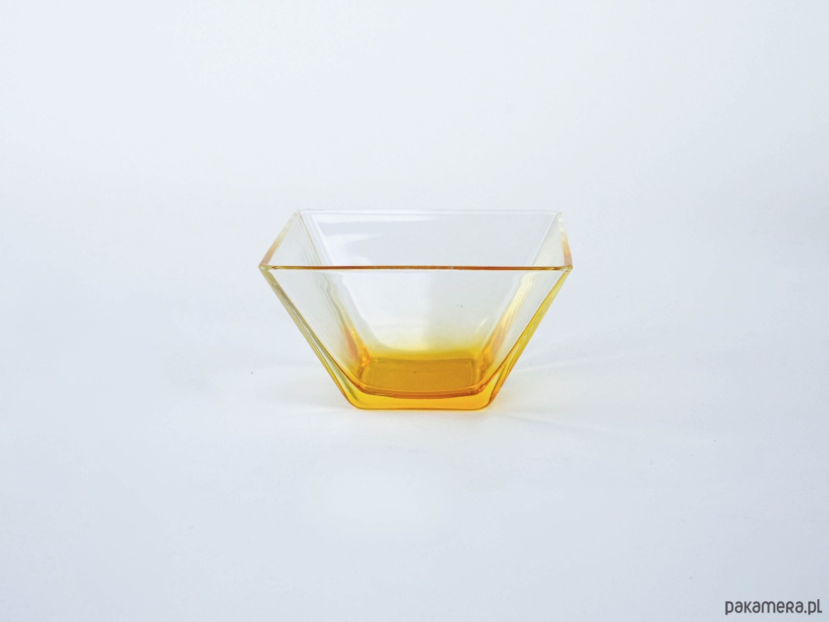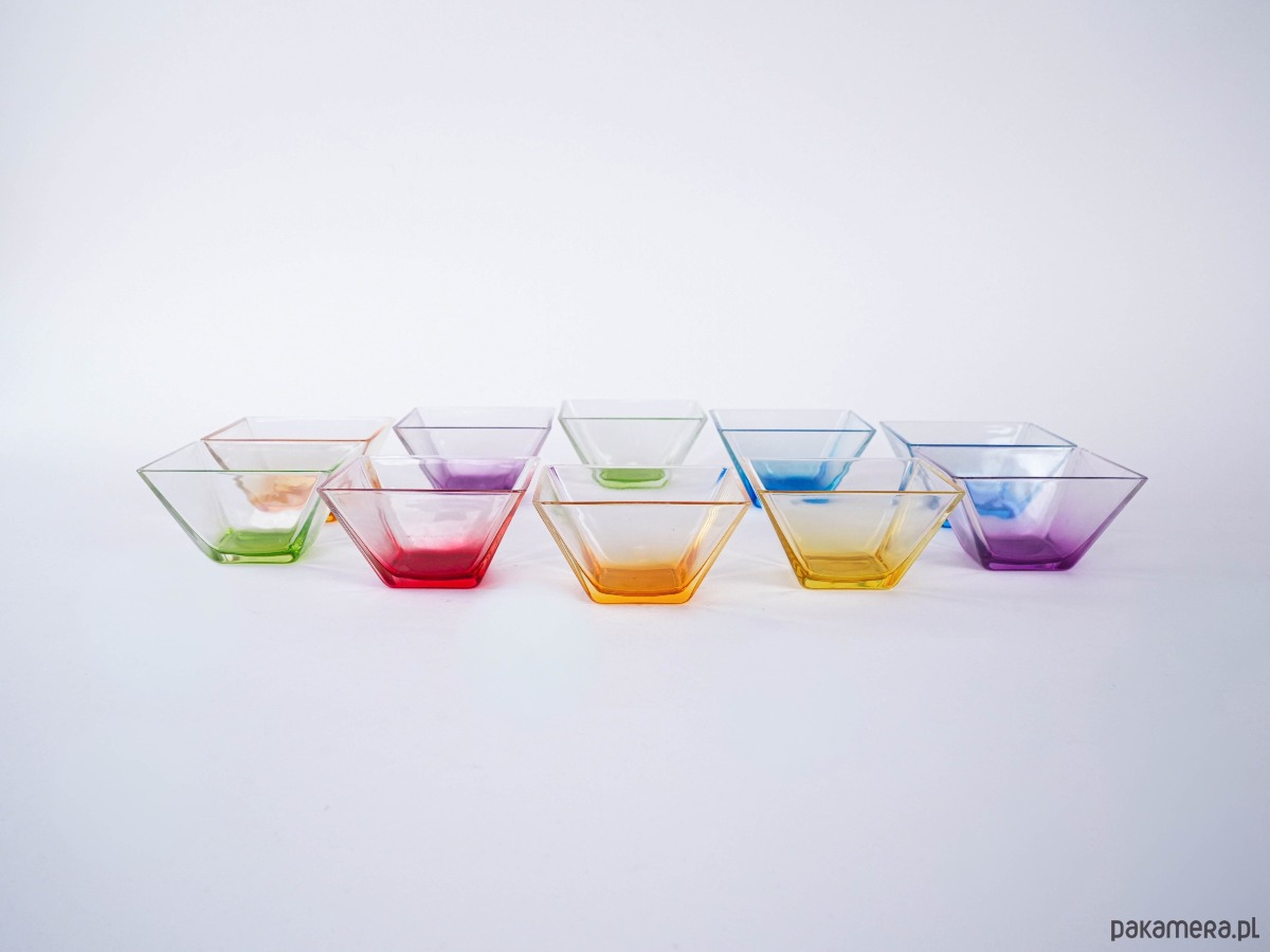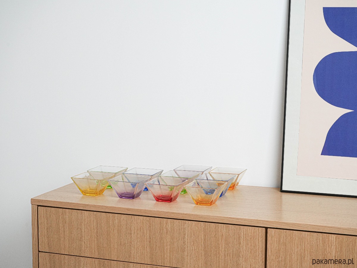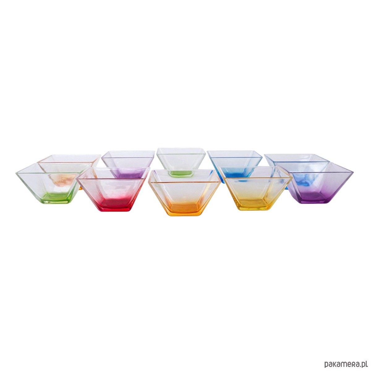 Zestaw dziesięciu kwadratowych miseczek z transparentnego szkła w intensywnych kolorach: żółtym, czerwonym, zielonym, niebieskim, fioletowym i bezbarwnym. Każda miseczka ma lekko rozchylone ku górze ścianki, co nadaje im nowoczesny, geometryczny charakter. Idealne do serwowania deserów, przekąsek lub dodatków, wprowadzając na stół radosny, kolorowy akcent.