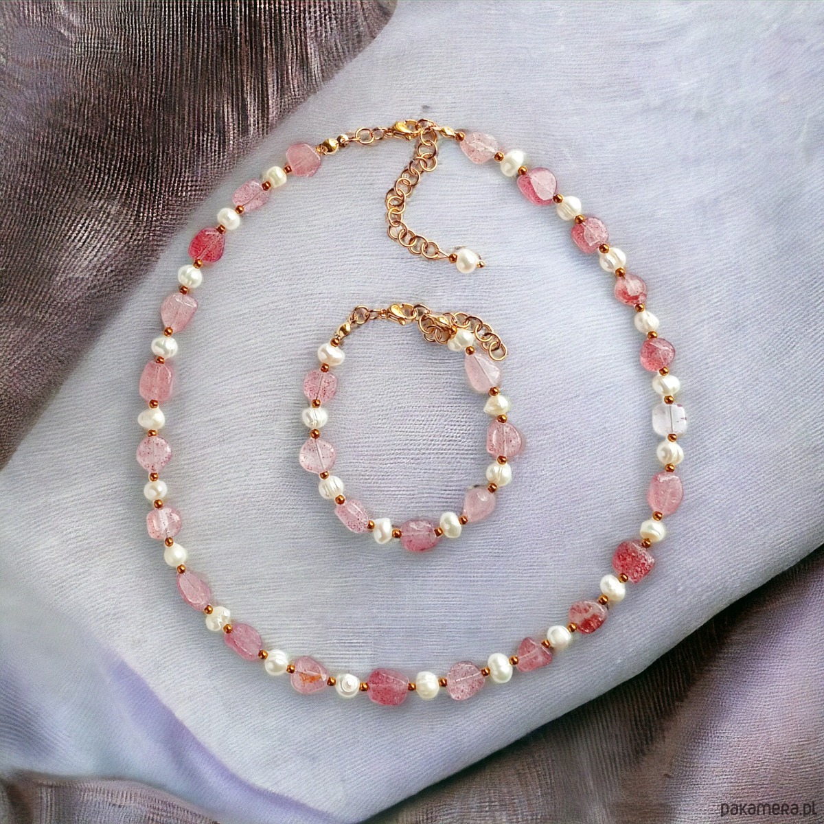 KOMPLET - kwarc truskawkowy & PERŁY - naszyjnik & bransoletka