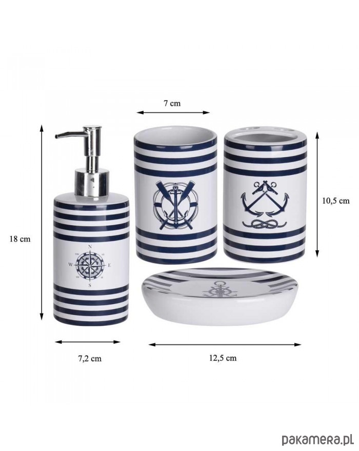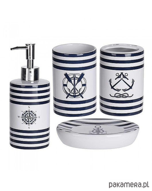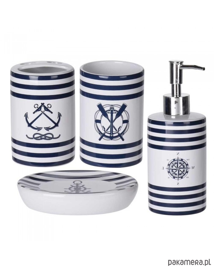 Zestaw akcesoriów łazienkowych jest wykonany z wysokiej jakości ceramiki z motywem marynistycznym. Składa się z dozownika na mydło, kubka na szczoteczki do zębów, kubka i mydelniczki. Kubek na szczoteczki ma specjalne otwory do przechowywania 2 szczoteczek. Dla miłośników morskich podróży.
