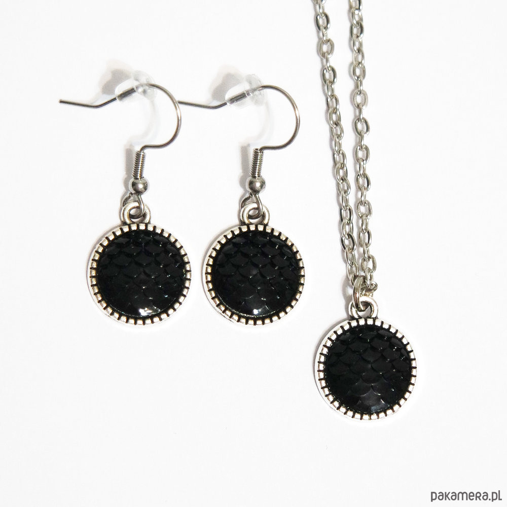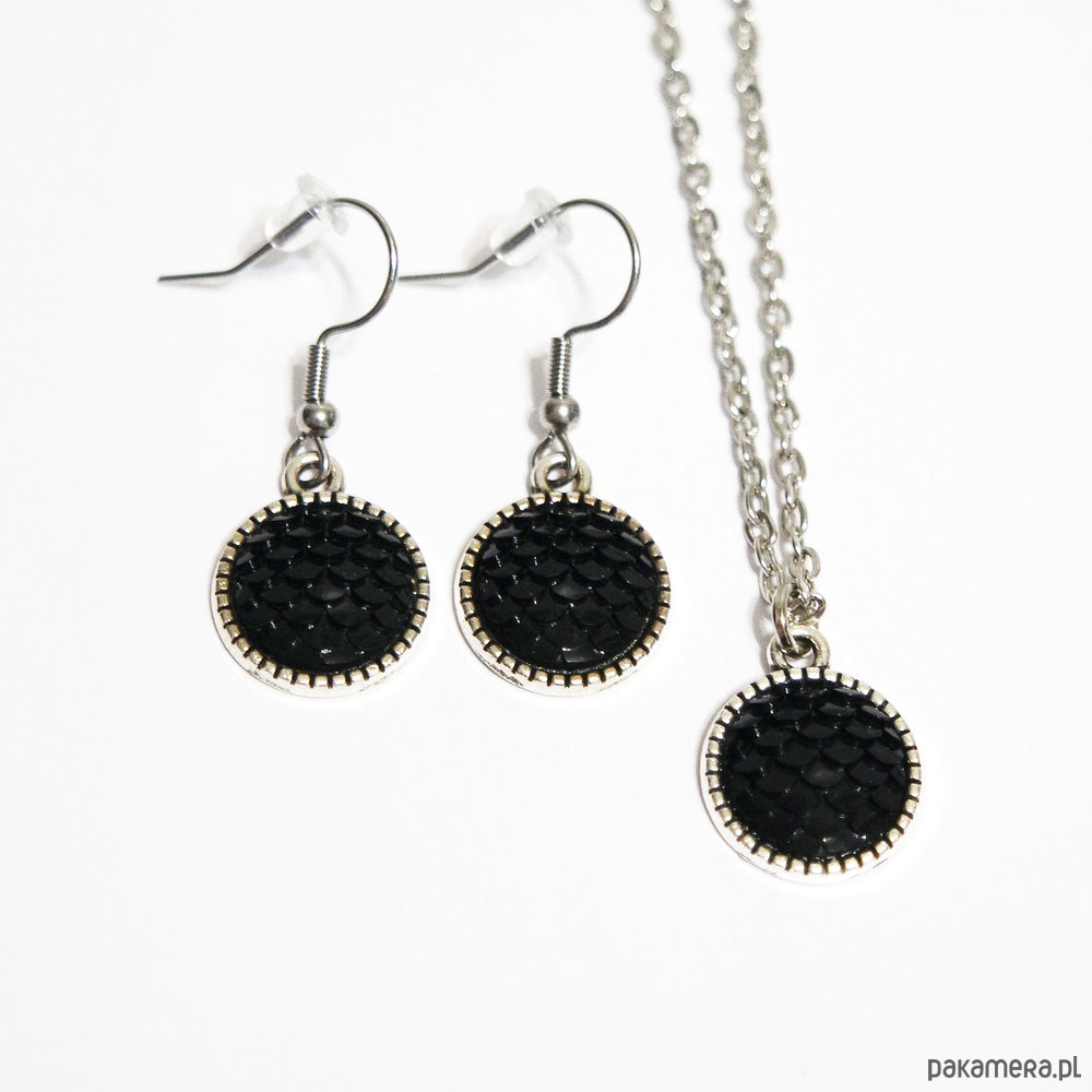 Niezwykłe, subtelny, mały naszyjnik z kaboszonem z żywicy imitującym łuski oraz kolczyki wiszące na otwartych biglach ze stali szlachetnej.