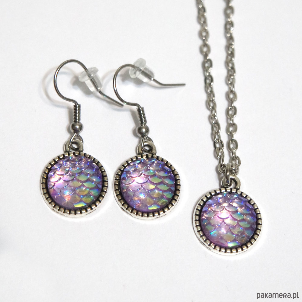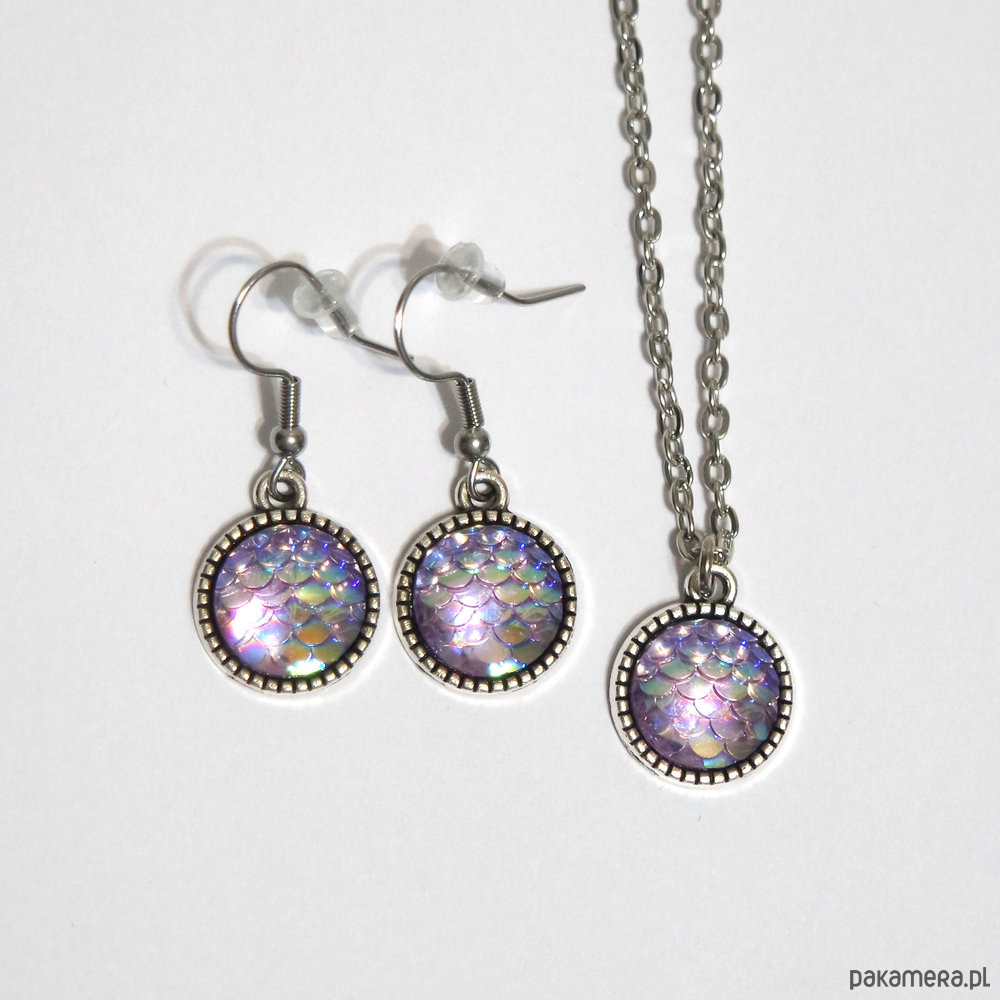 Niezwykłe, subtelny, mały naszyjnik z kaboszonem z żywicy imitującym łuski oraz kolczyki wiszące na otwartych biglach ze stali szlachetnej.