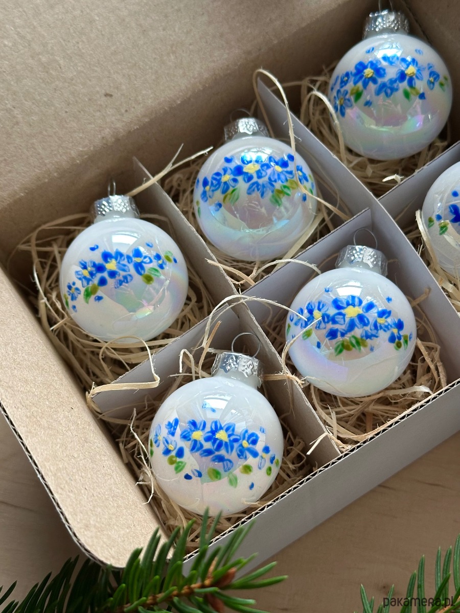 Komplet 6szt ręcznie malowanych perłowobiałych bombeczek ze szkła.