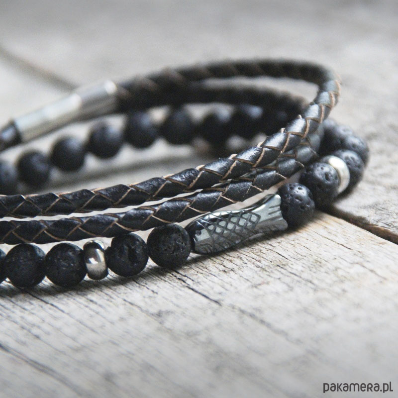 TUTAJ: KOMPLET W NIŻSZEJ CENIE ... 2 proste, lecz ciekawe bransoletki wykonane z: 1)rzemienia plecionego ze SKÓRY NATURALNEJ (4mm) w kolorze CZARNYM - do dwukrotnego owinięcia. WYGODNE, BEZPIECZNE ZAPIĘCIE - zapięcie TZW. wtykowe (antyalergiczne). ..PASUJE NA NADGARSTEK standardowy (ok.18,5cm)... 2)bransoletka wykonana z kul porowatej lawy wulkanicznej (6mm). na środku : rybka - koralik wykonany z rzeźbionego hematytu, dodatkowo 2 masywne pierścienie ze STALI SZLACHETNEJ (nie uczula, kolor nie ściera się) ...