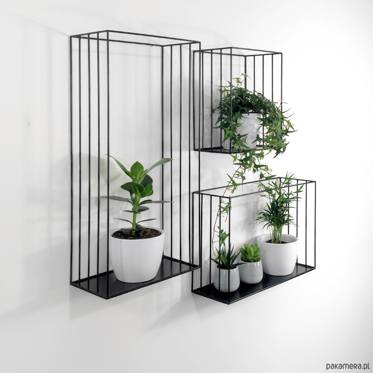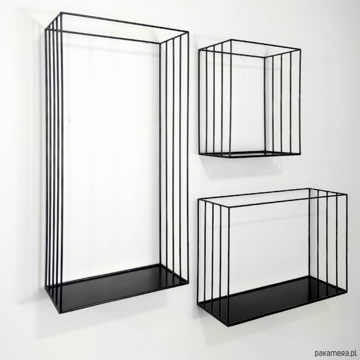 Przedmiotem jest komplet 3 metalowych półek w kolorze czarnym, które świetnie sprawdzą się jako minimalistyczne, metalowe kwietniki na ścianę.
