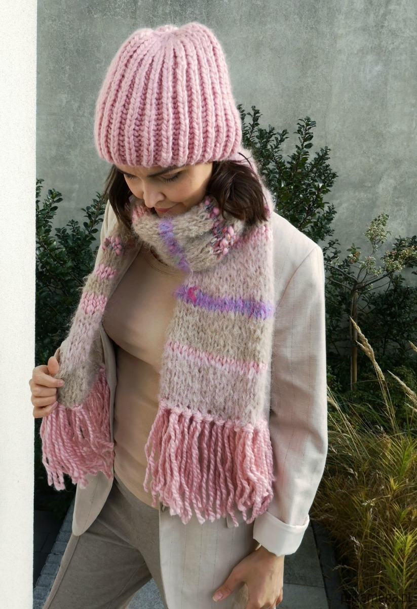 Zestaw Mia składa się z czapki splecionej na drutach z włóczki z dużą ilością wełny oraz szalika z alpaki, merino , jedwabiu z dodatkiem fantazyjnych włóczek.