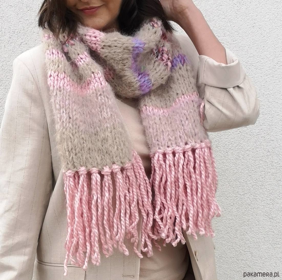 Skład szalika: baza: alpaka, merino , jedwab plus włóczki fantazyjne