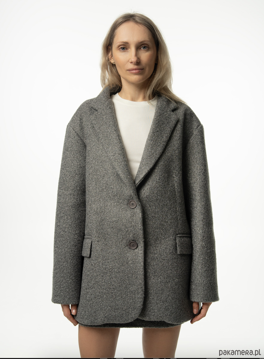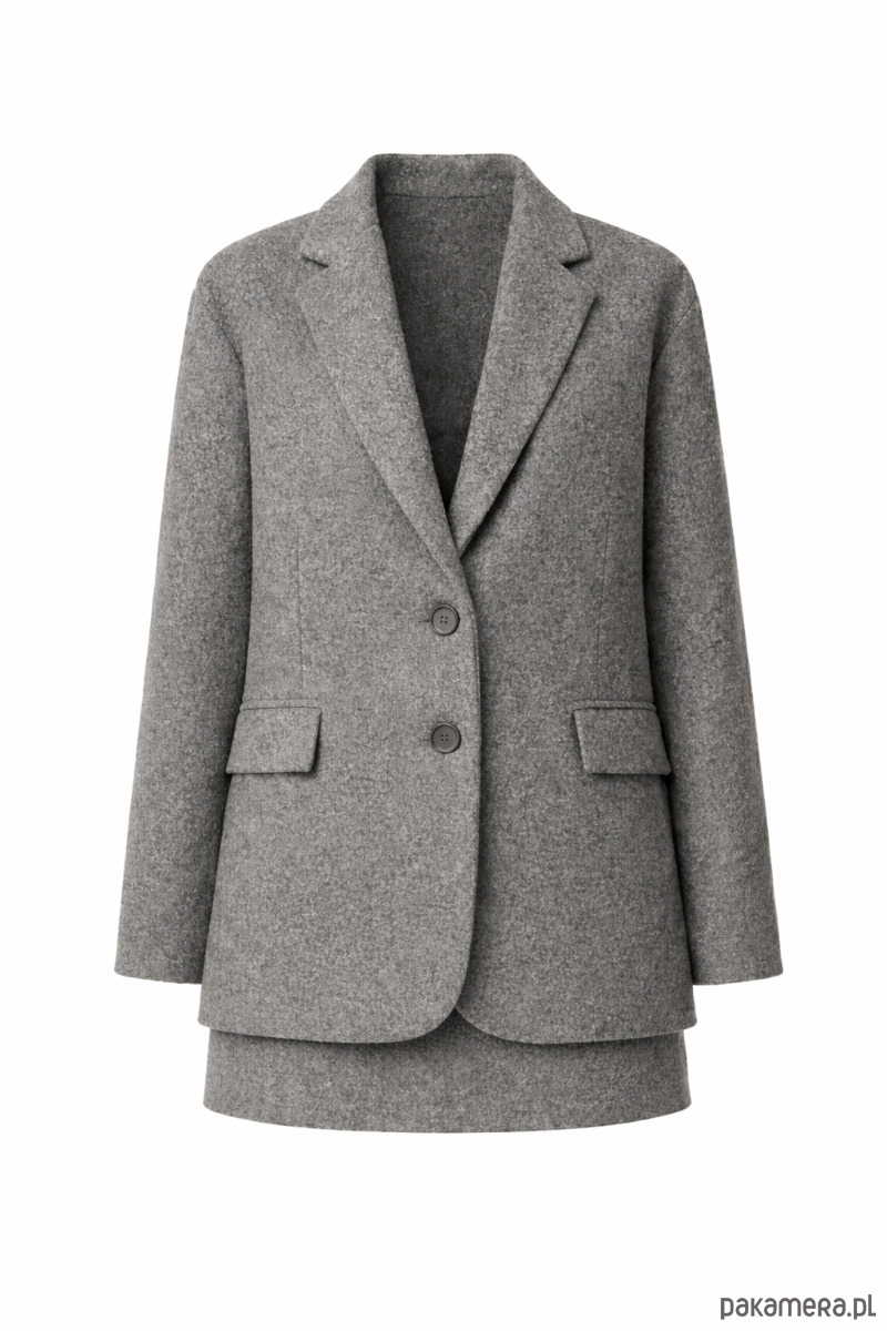 Elegancka marynarka w stylu oversize i dopasowana spódnica mini tworzą duet, który łączy klasykę z miejskim szykiem. Uszyte z wysokiej jakości mieszanki z wełną (30% wełna, 70% poliester), zapewniają komfort noszenia i stylowy wygląd na co dzień i do pracy.Szary, neutralny kolor pozwala na łatwe łączenie z innymi elementami garderoby, a razem z dopasowaną spódnicą stanowi doskonały zestaw na chłodniejsze dni. Możliwość zakupu oddzielnie – stwórz własną stylizację lub postaw na gotowy komplet!