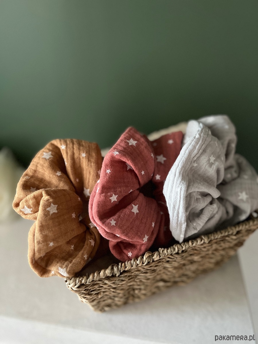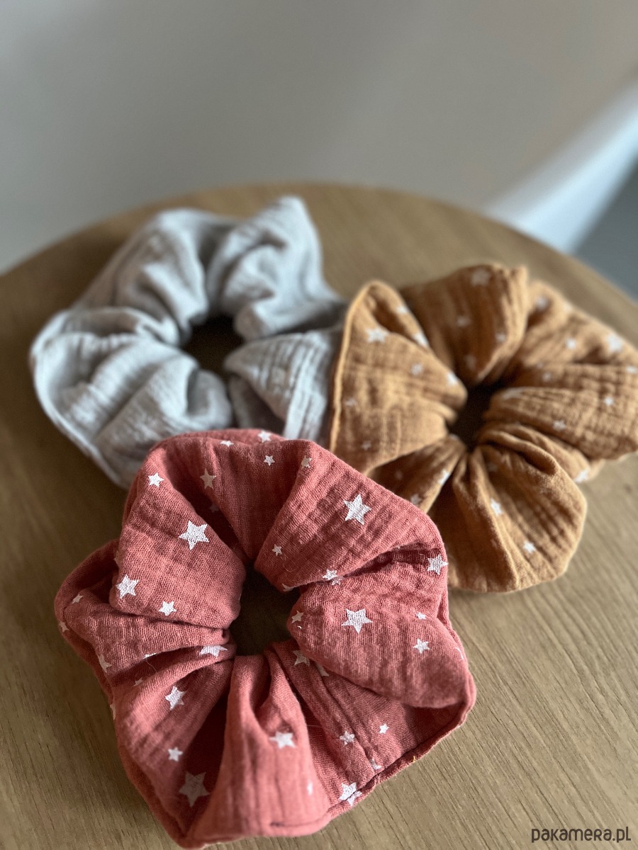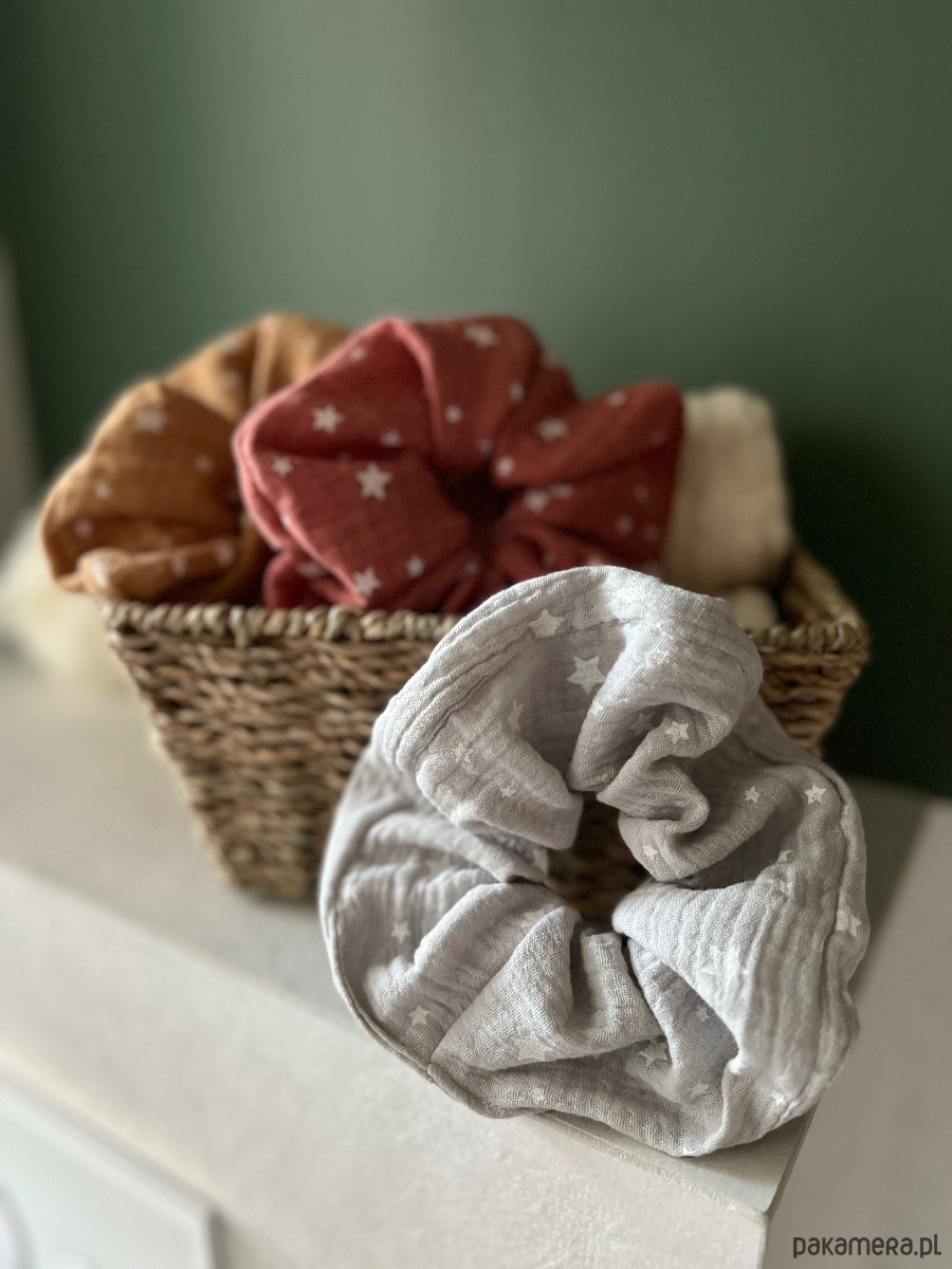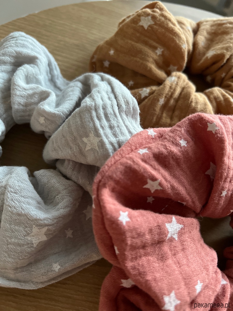 Scrunchie są wykonane z naturalnej, oddychającej tkaniny, przyjemnej w dotyku i idealnej na cały rok — szczególnie na cieplejsze dni. Dobrze trzymają włosy, a jednocześnie nie powodują dyskomfortu nawet przy dłuższym noszeniu.