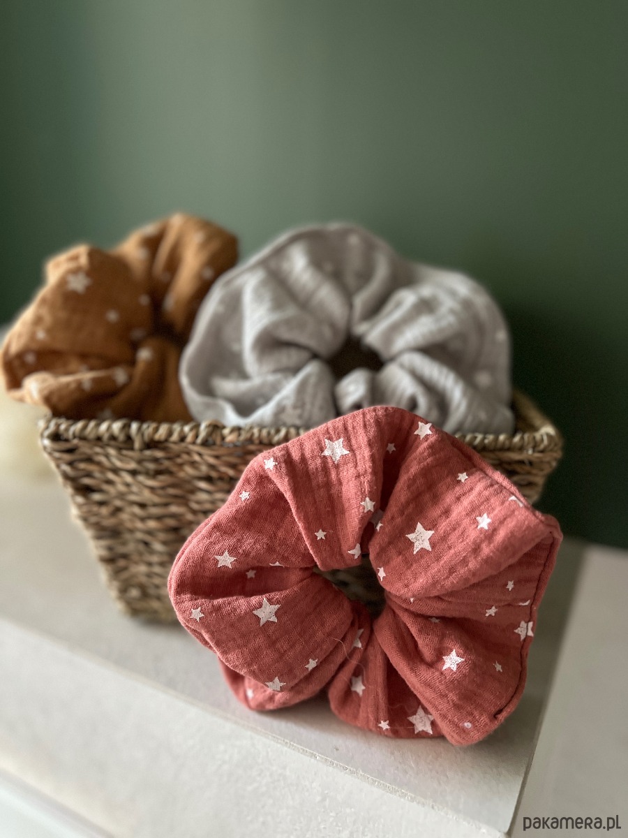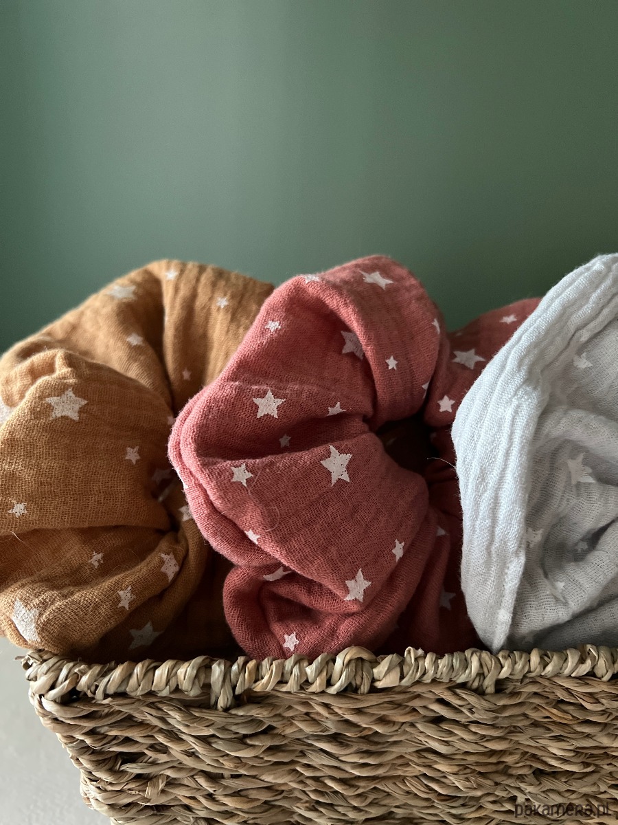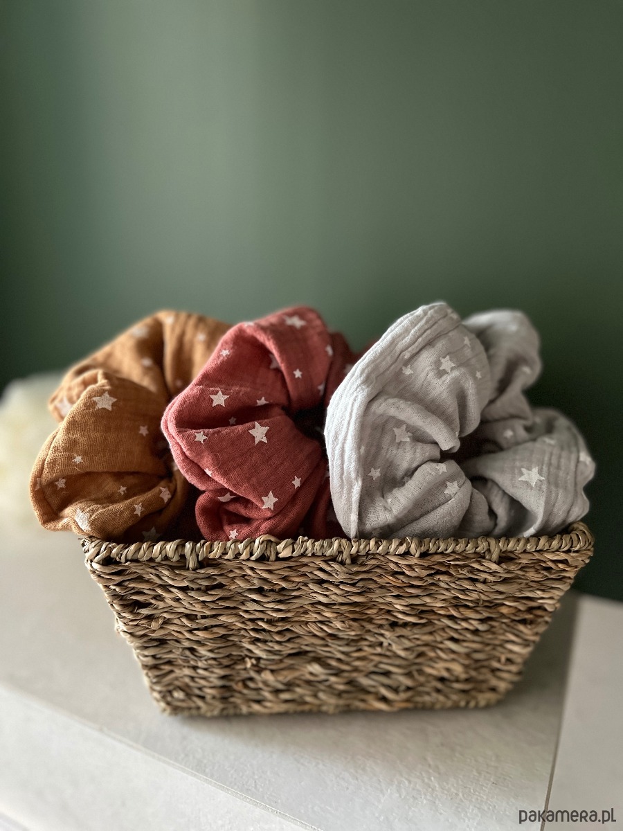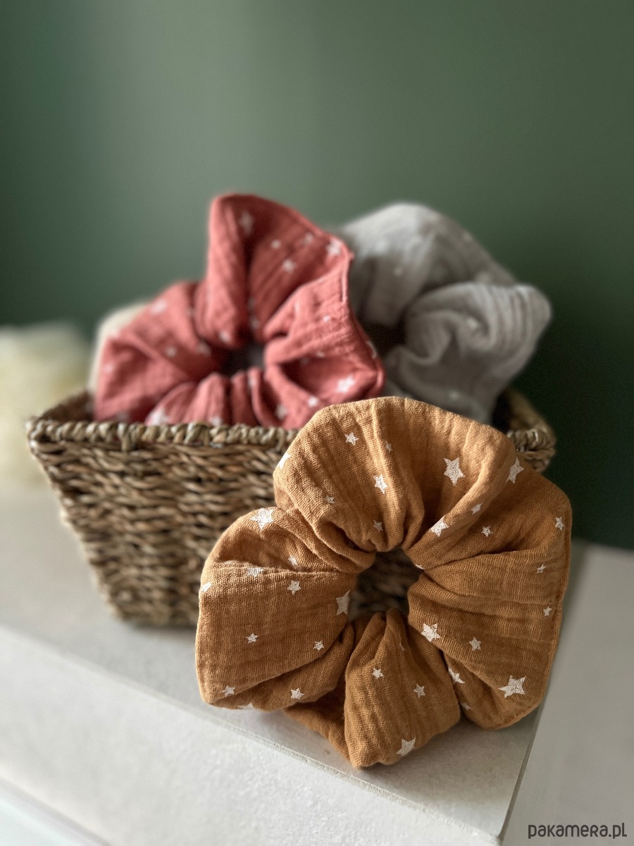Scrunchie są wykonane z naturalnej, oddychającej tkaniny, przyjemnej w dotyku i idealnej na cały rok — szczególnie na cieplejsze dni. Dobrze trzymają włosy, a jednocześnie nie powodują dyskomfortu nawet przy dłuższym noszeniu.