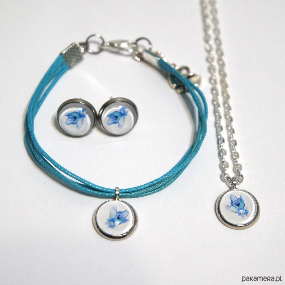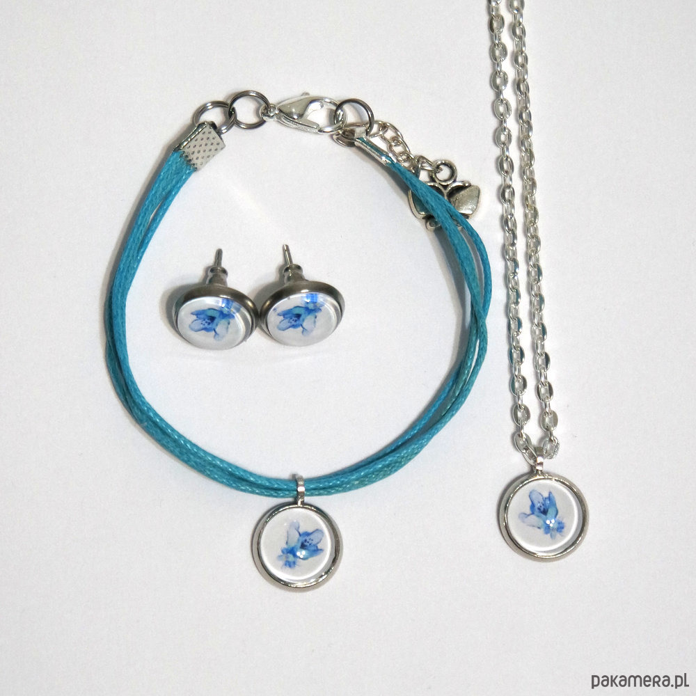 Komplet mini - Niebieski kwiat - kolczyki, bransoletka, naszyjnik