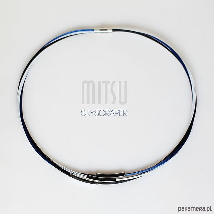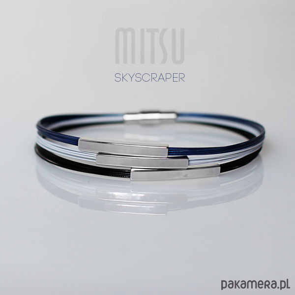 Zbudowany na bazie czarnej, białej i granatowej linki jubilerskiej.
