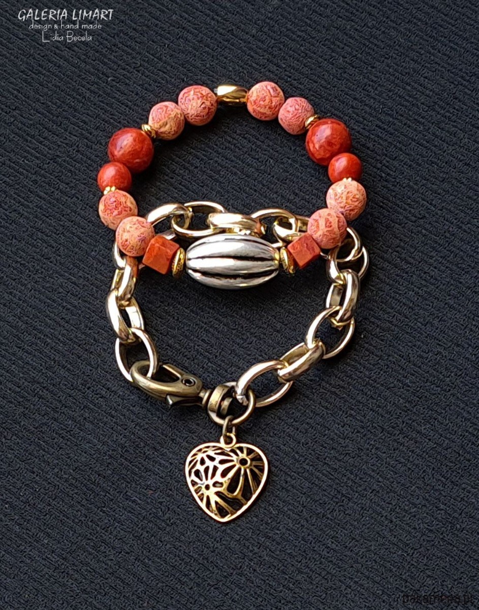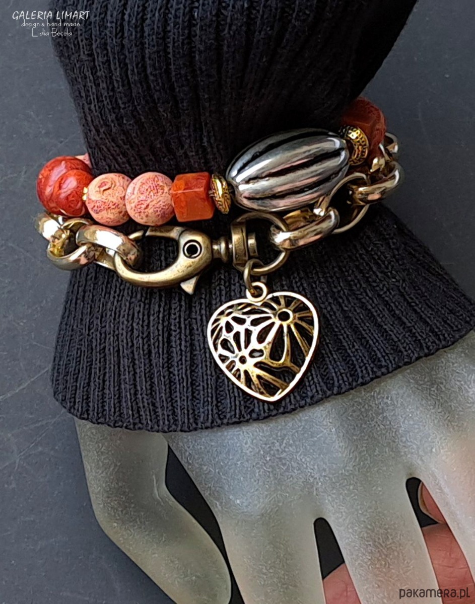 Efektowny zestaw 2 bransoletek jak na zdjęciu (każda inna), tworząca jedną całość, ale nie koniecznie. Można dowolnie komponować zestaw bransoletek w zależności od upodobań albo nosić każdą osobno. Jedna bransoletka jest nanizana na elastyczny nośnik w tym przypadku są to korale suchy i koral rekonstruowany plus elementy dekoracyjne, druga to masywny metalowy łańcuch ozdobiony ażurowym mosiężnym sercem i efektownym dużym karabińczykiem. Znakomicie komponują się na przegubie. Długość każdej bransoletki ok. 19 cm w sam raz na nadgarstek 15-17 cm
