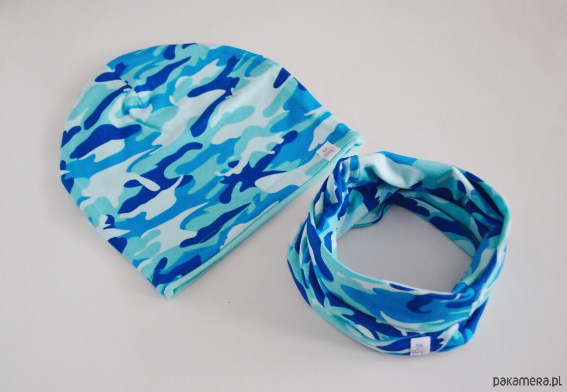 W komplecie: czapka i komin uszyte z dresówki (rozciągliwej bawełny)