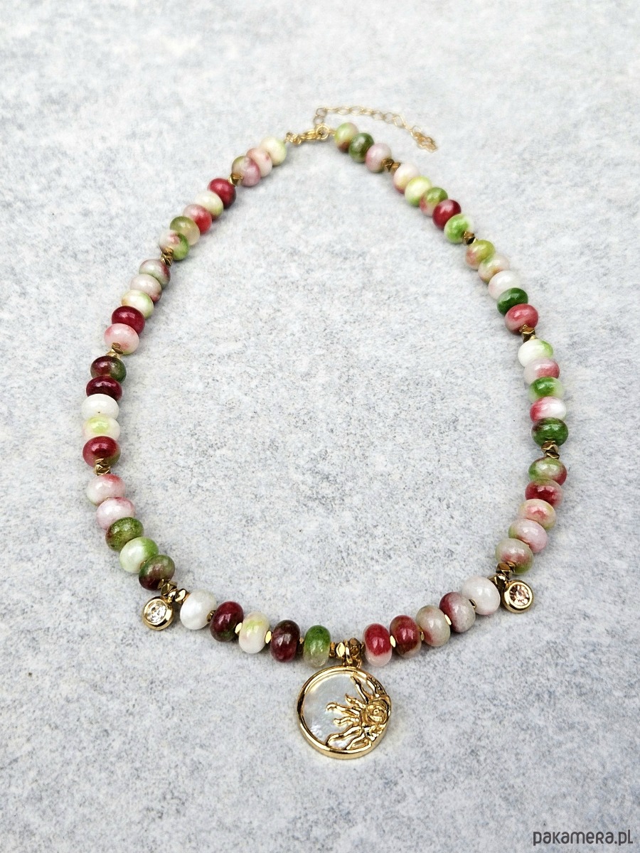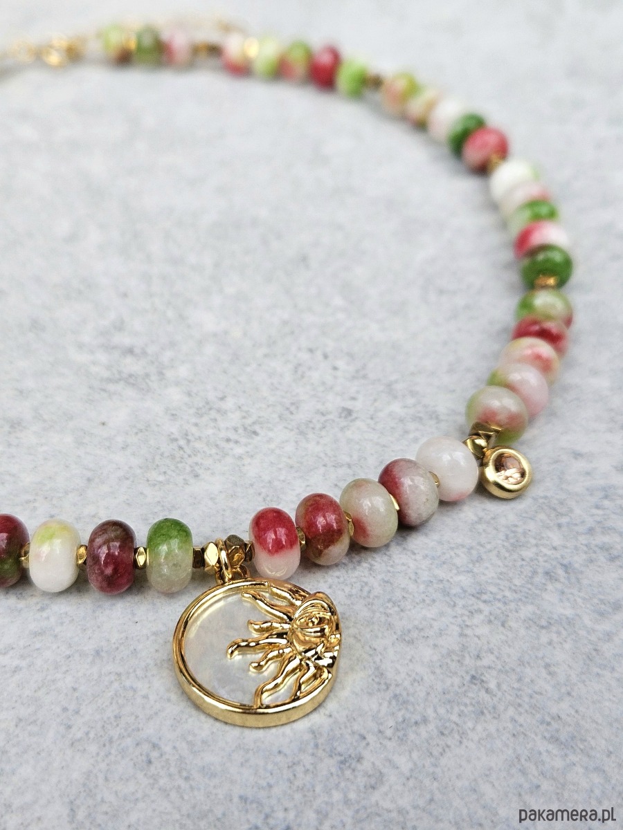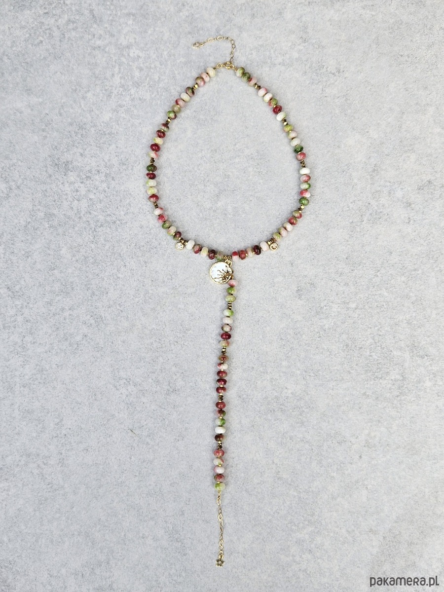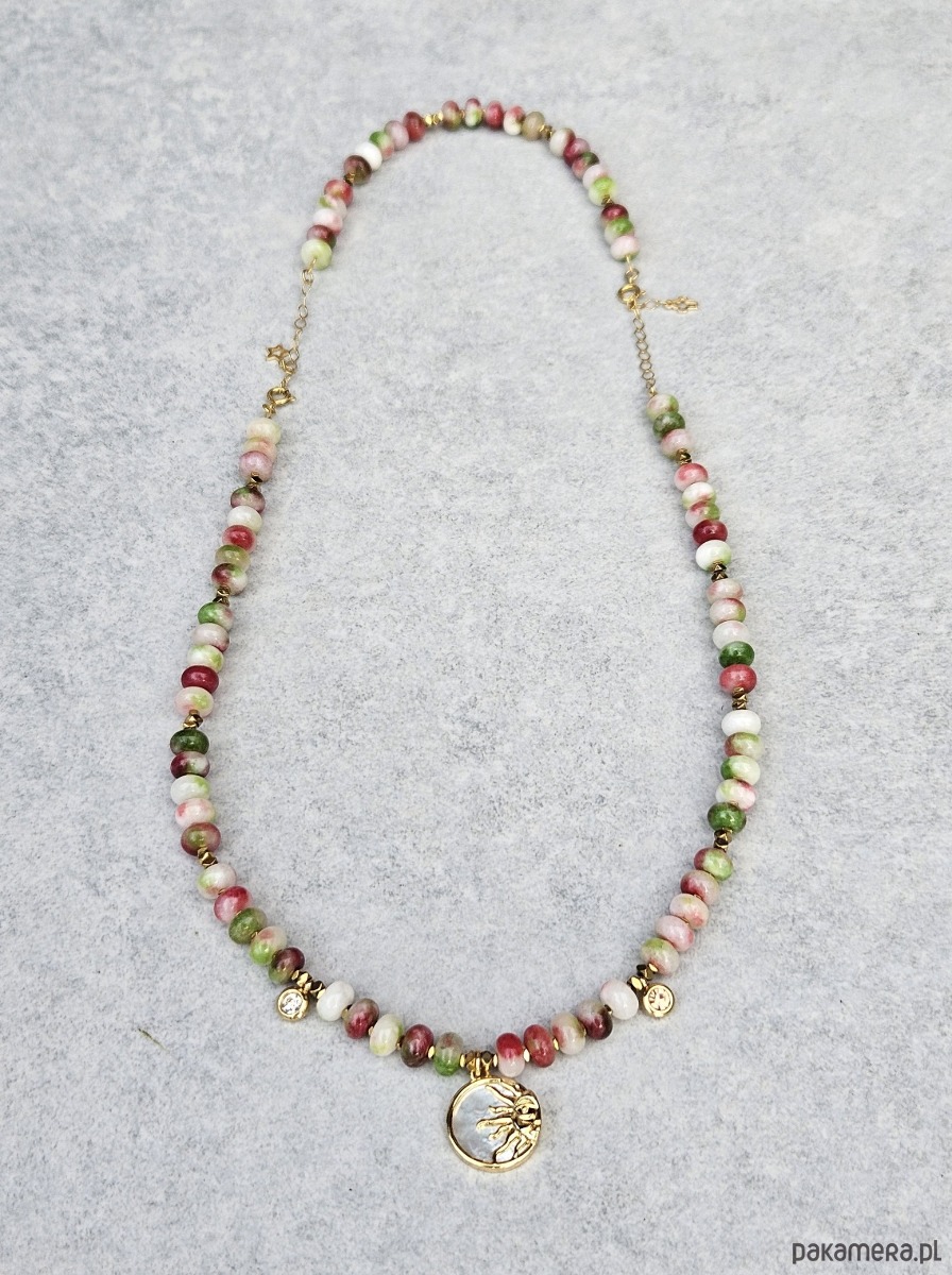 Naszyjnik wykonany z pozłacanego srebra 925 (zapięcia i przedłużki) oraz ze stali szlachetnej.