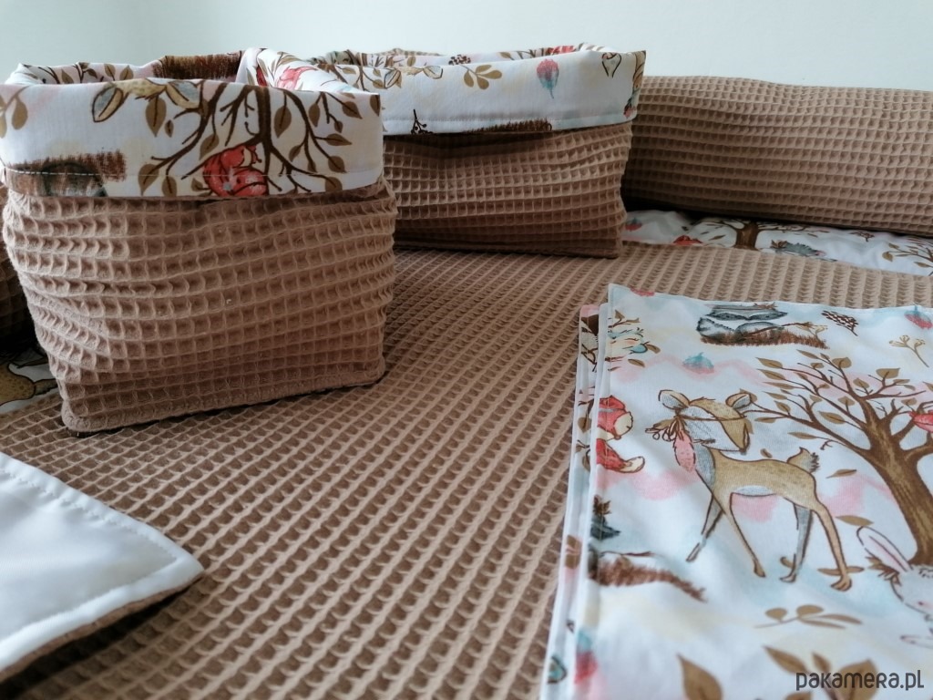 Koszyczki są wykonane z materiałów takich jak mata do przewijania i posiadają dodatkowe usztywnienie. Wymiary dna: mniejszy koszyk 15x10cm, większy koszyk 15x20cm