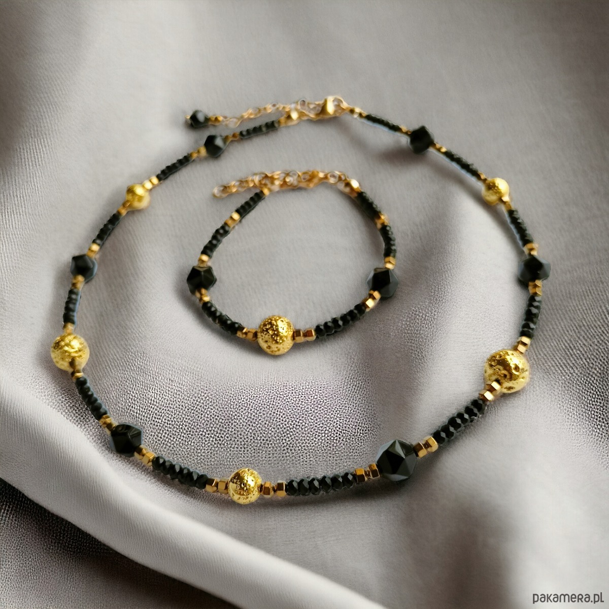 1) Krótki naszyjnik - choker na solidnej lince stalowej (miękkiej) - został wykonany z drobnych, fasetowanych oponek czarnego jadeitu (2x3mm), złotej lawy wulkanicznej (ok. 7 i 10mm), onyksu (ok 8-9mm) i z złotego hematytu (3mm) o ciekawym szlifie.