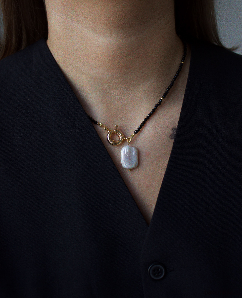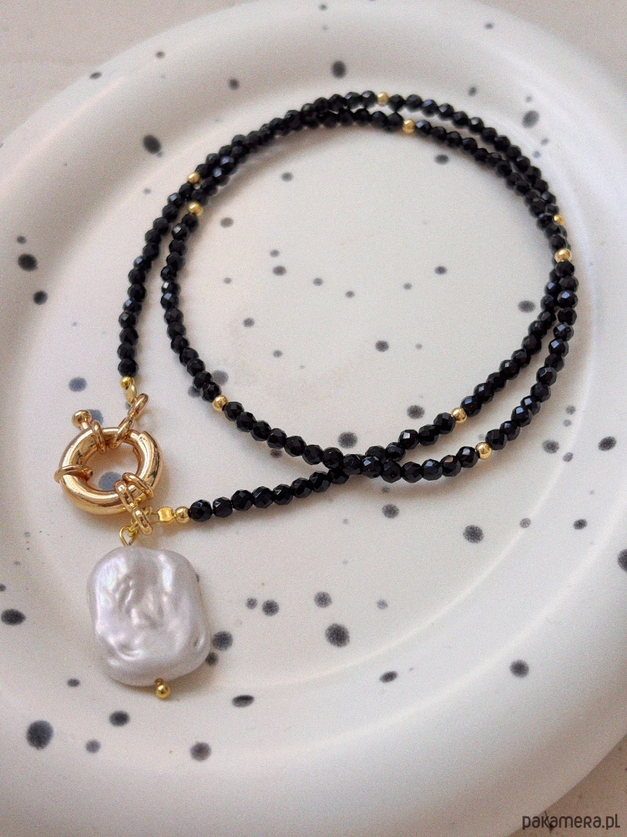 Naszyjnik wykonany jest na lince jubilerskiej z użyciem onyksu oraz zawieszki z perły unikatowej, zapięcie ozdobne wykonane z mosiądzu rodowanego złotem.