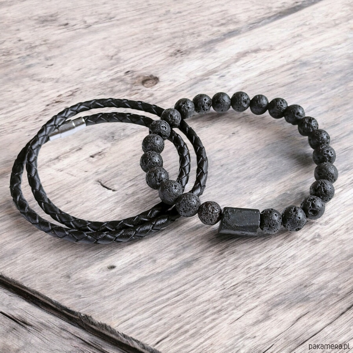 wykonana z czarnego turmalinu (bryłka surowa,ciosana) oraz porowatej lawy wulkanicznej (8mm)