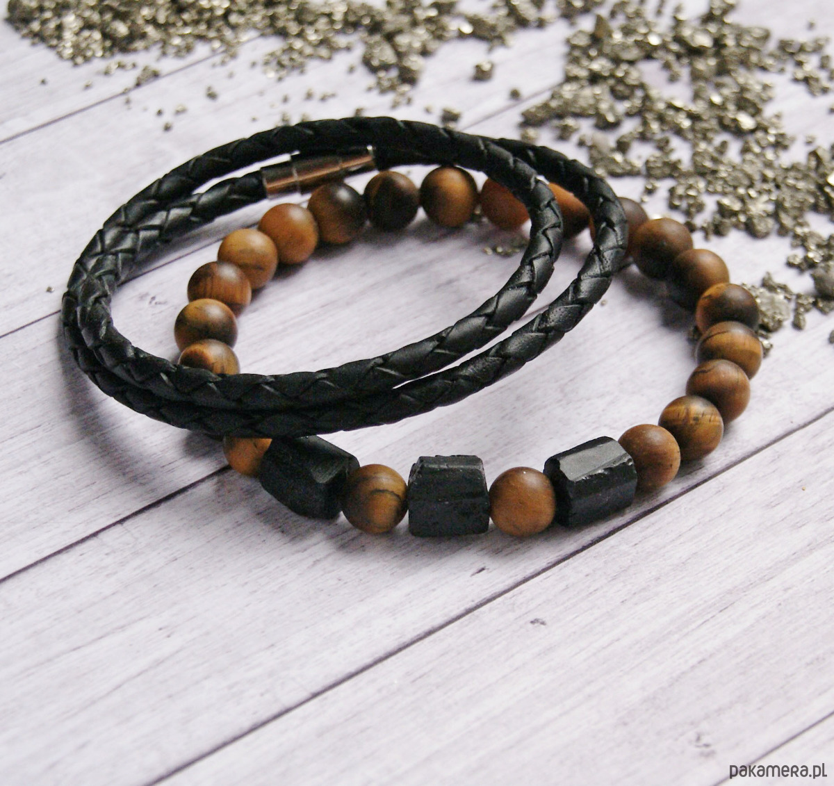 1) niezwykle ciekawa bransoletka wykonana z kulek matowego tygrysiego oka (8mm) oraz trzech bryłek surowego czarnego turmalinu (wielkość i wygląd bryłek różni się nieco w każdej bransoletce). bransoletka na solidnej, czarnej gumce jubilerskie. brak elementów metalowych.