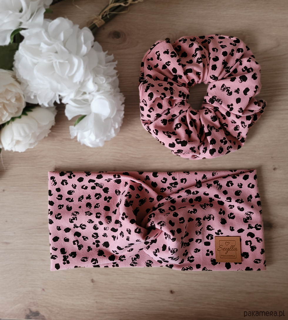 Przepiękny komplet z cudownie miekkiej i przyjemnej dzianiny w panterkę w odcieniach przydymionego różu.