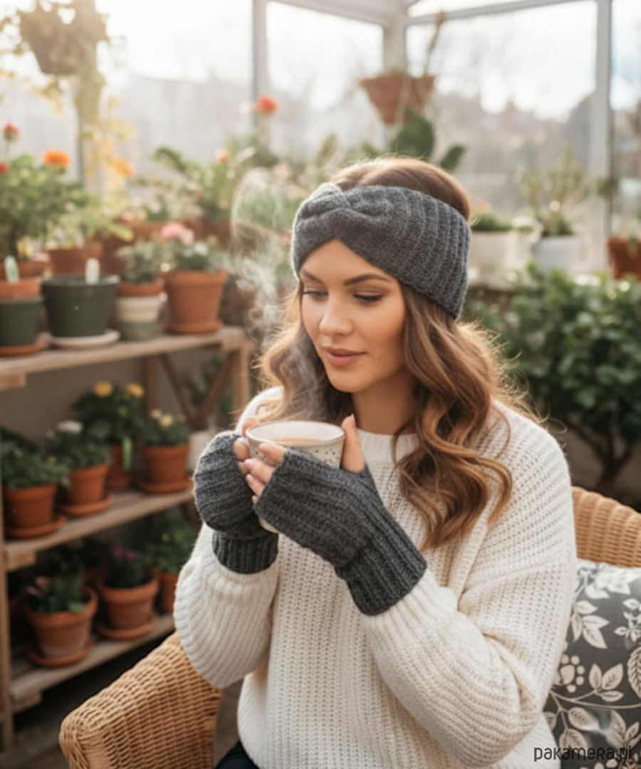 Komplet opaska na głowę i rękawiczki mitenki na szydełku