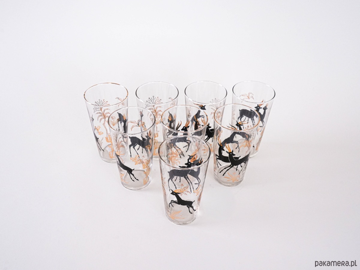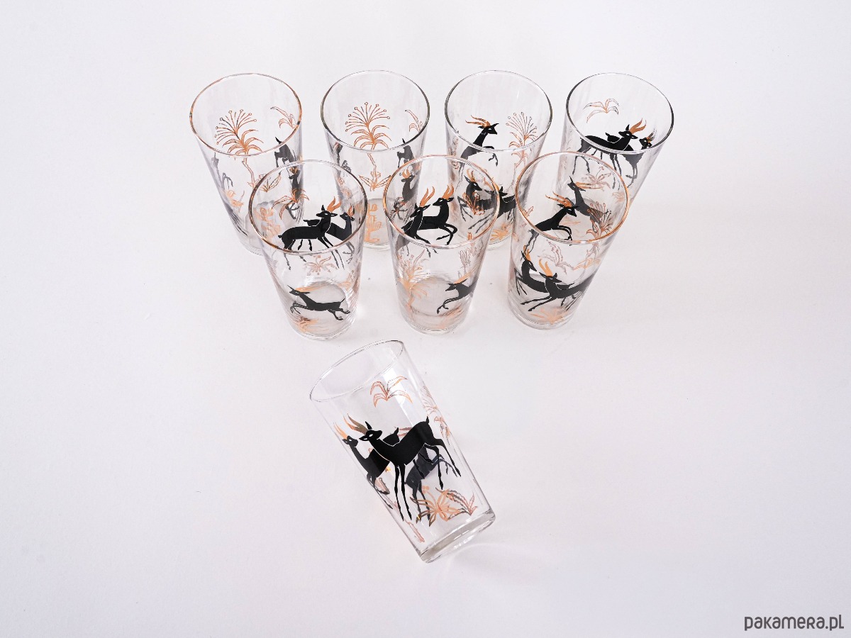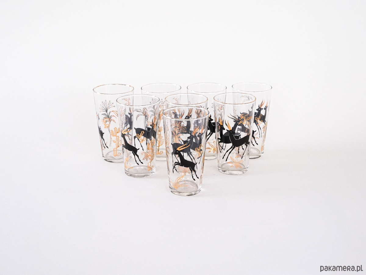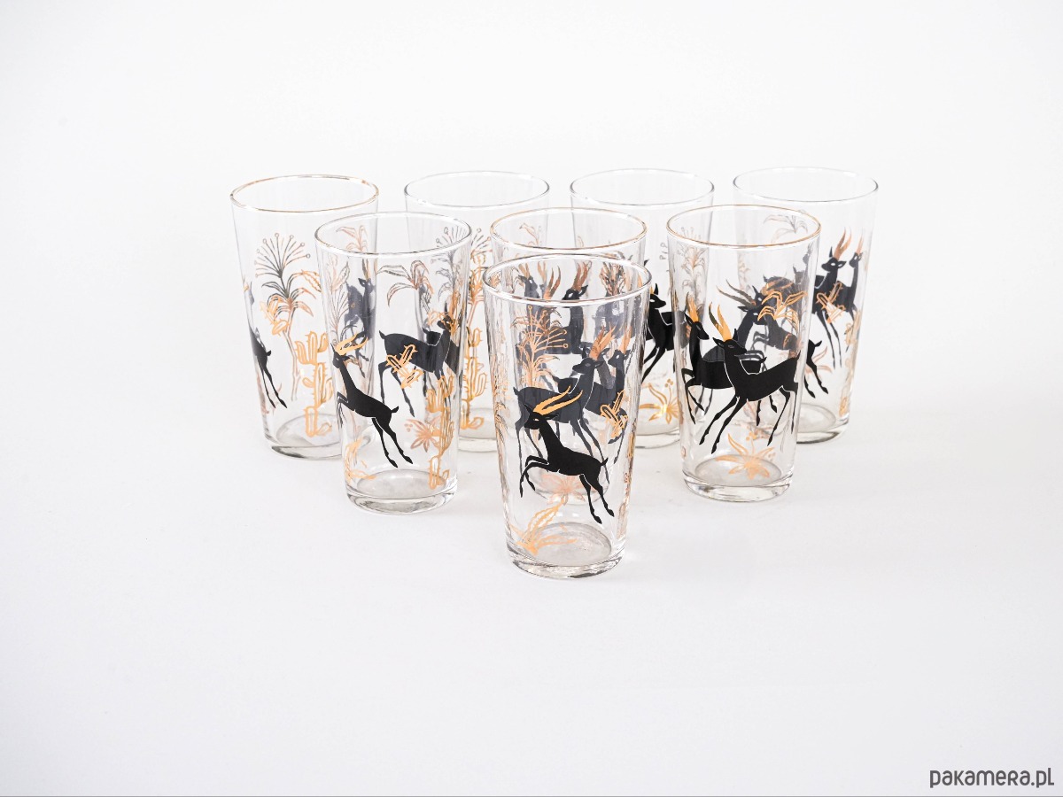 Każda sztuka zdobiona jest efektownym czarno-złotym motywem przedstawiającym gazele igrające wśród złotych traw. Stylowy zestaw z połowy XX wieku, doskonały zarówno do codziennego użytku, jak i jako element kolekcjonerski.