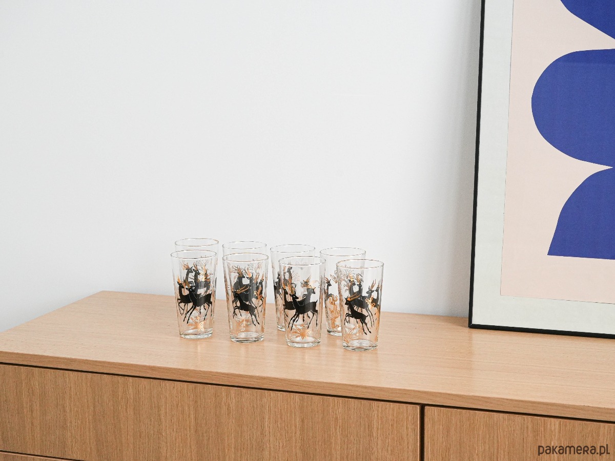 Zestaw ośmiu szklanek wykonany został w latach 70-tych, produkcja duńska.