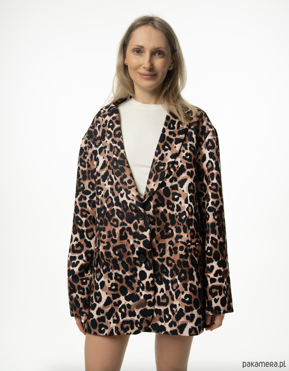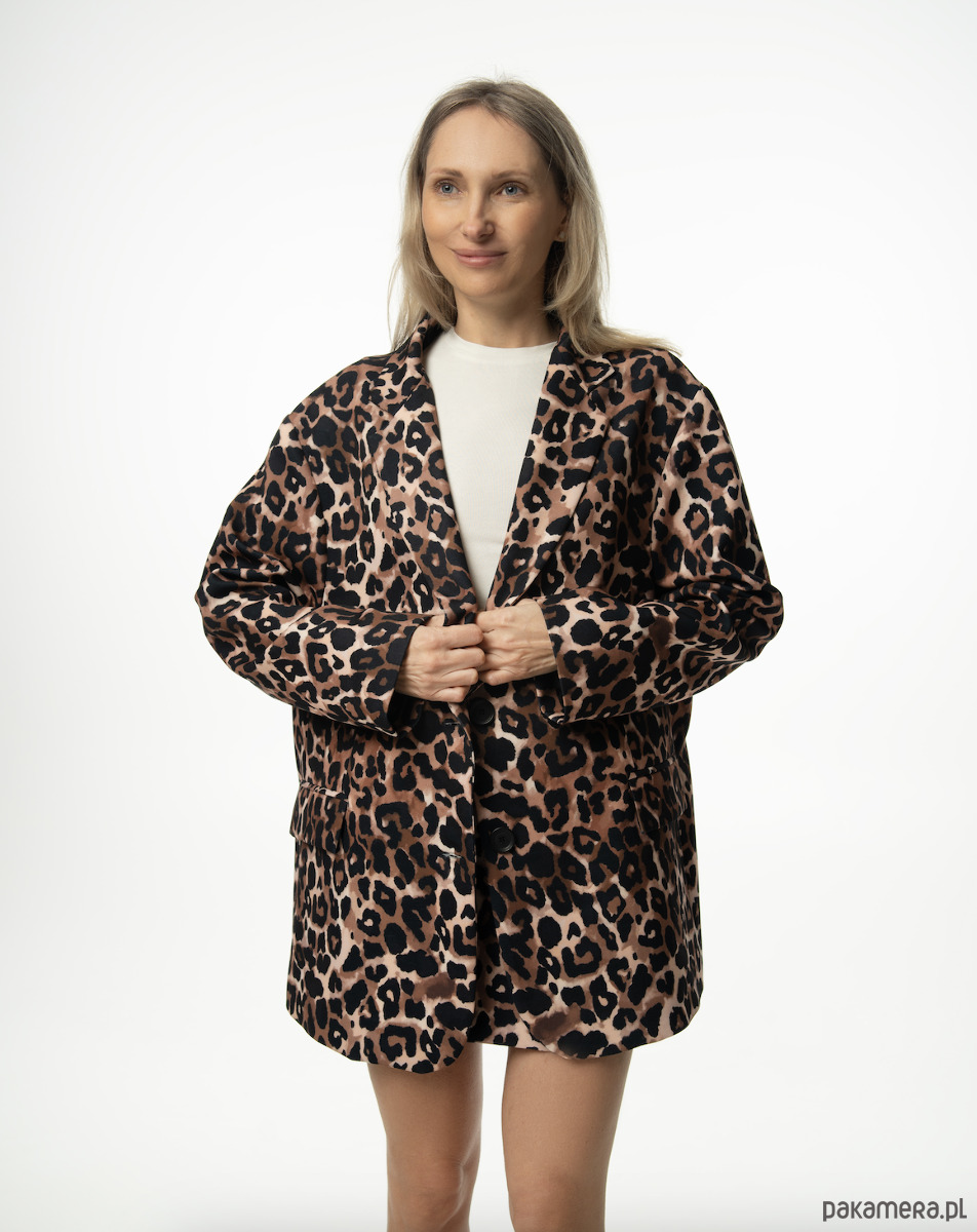 Wyrazisty, kobiecy i niezwykle stylowy komplet „Panterka” to propozycja dla kobiet, które lubią łączyć klasyczną formę z odważnym charakterem. Panterkowy wzór dodaje pewności siebie i przyciąga spojrzenia, zachowując przy tym elegancki balans. Marynarka o luźnym kroju oversize pięknie układa się na sylwetce, zapewniając komfort noszenia i nowoczesny look. Dwa rozcięcia z tyłu nadają jej lekkości i swobody ruchu, a kieszenie podkreślają funkcjonalny charakter modelu. Całość wykończona jest starannie wszytą podszewką, co podnosi komfort i estetykę noszenia.